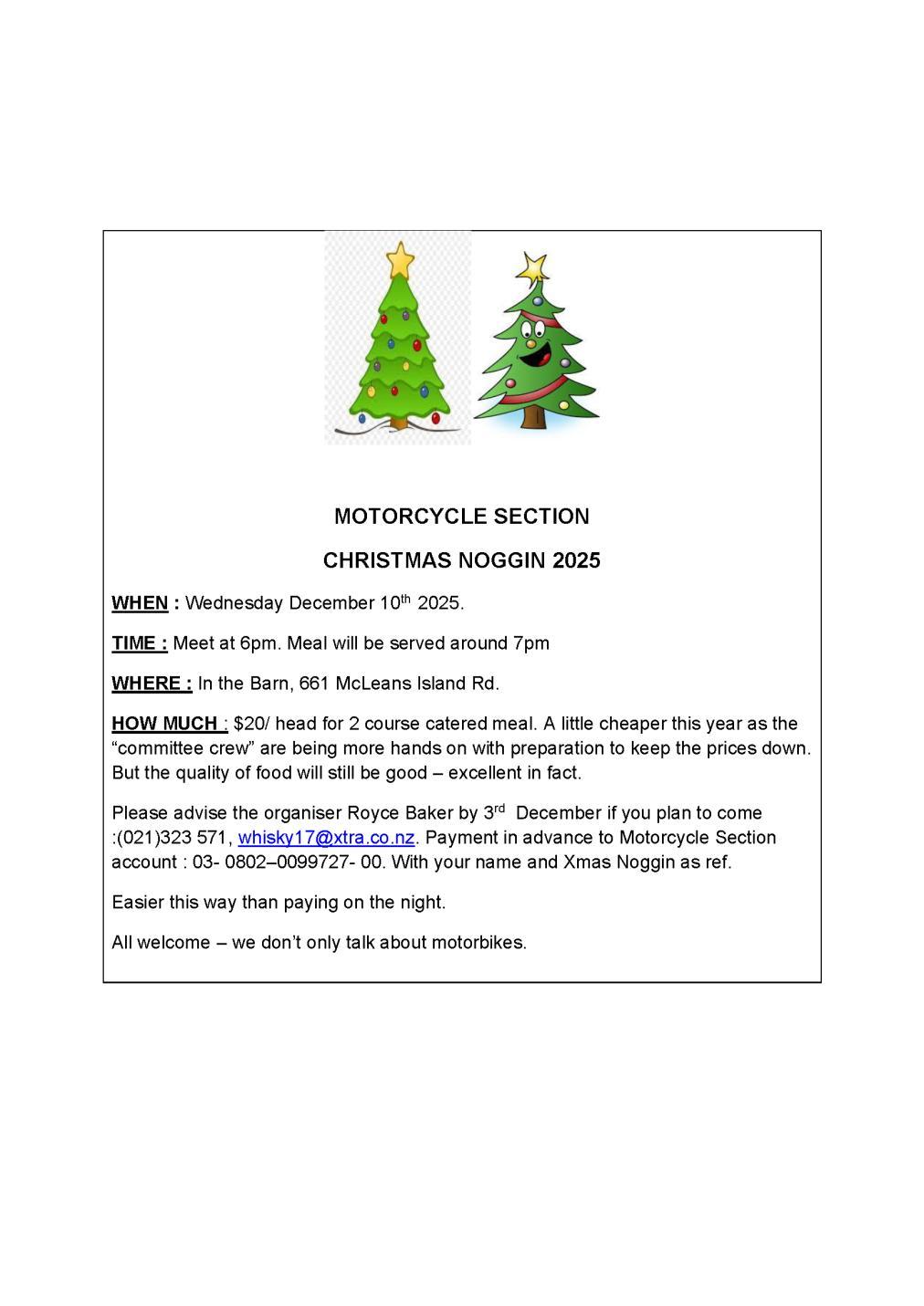 Children's Christmas Party, Boxing Day picnic, New Years day picnic, in Little River. The Commercial Run and Annual Rally in February are coming around quickly. As always the continuation of the 9-90’s and Vog Runs throughout the year. Not least forgetting OCBC (Old, Bikes, Coffee and Cars).