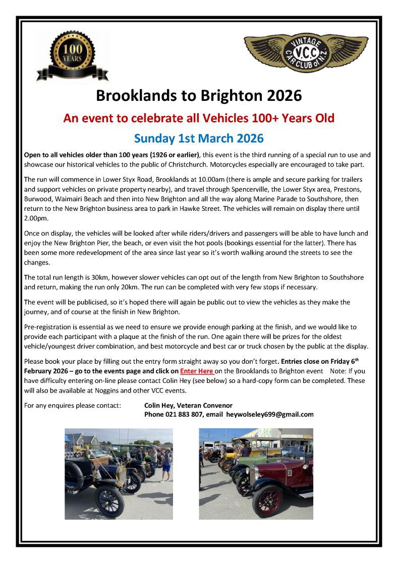 Weekend of 14th and 15th February – Veteran Car Club Annual Summer Rally, Geraldine (Formerly Mid-Summer Adventures), also open to any VCC veteran vehicles. Registration forms were in the last Veteran Car Club Bulletin, or if you don’t subscribe to that, please contact Colin Hey for an entry form if you’re interested in going. In the meantime we suggest you book your accommodation as soon as possible as Geraldine is a popular destination at that time of the year.