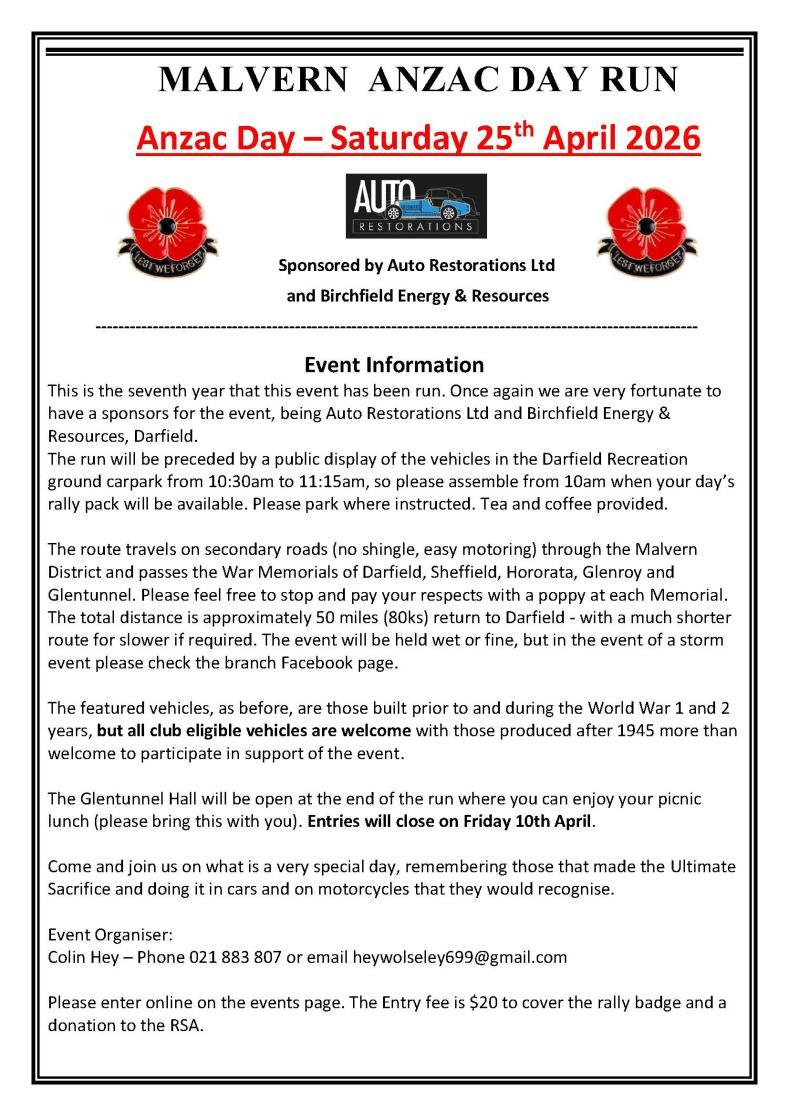 Our annual run to celebrate and remember Anzac Day. See notice after this page. The run will once again start in Darfield from the Darfield Recreation Centre, North Terrace. Meet from 10am, run departs after a short commemorative service at 11.00am, then visits several Malvern War Memorials before finishing in Glentunnel.