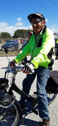 What a fantastic feeling, a bright sun shiny day, wind in your face and the purr of the wee 49cc Velosolex motor between ones legs . That was the experience of the day on Tuesday 10th February when we headed off from the Prebbleton Reserve on yet another “VOG day” out. A small group of 10 riders plus our new backup Colin Hider turned up on the day as we headed off on the Little River Rail Trail following Birches Rd toward Lincoln with a short diversion through “Kakaha Park”. Some of you may have seen this as you travelled along Birches Rd, it’s a really nice setup with walking and cycling tracks through the park with a specific piece for BMX and Mountain bike riders, us ‘Solex riders opted out of this experience. There is also a separated space for taking your doggy for a walk and off the lead if you wish. Plus further out the back some sports grounds for Rugby and football. We were all most impressed with the setup – well worth the visit.