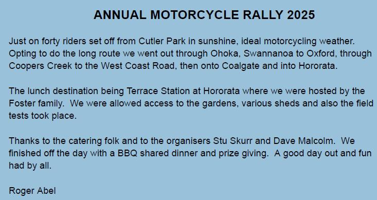 a BBQ lunch and prizegiving on Sunday. Thanks to everyone who took part, and to the large team that organised the many parts of it and helped to make it all happen. Before finishing this part of the report, I’d just like to make a special shout out to Bevars Binnie, who has been through and is still facing significant health issues at the moment. He made a special effort to turn up at both the Geraldine event and at the Annual Rally and say hello despite significant mobility problems. It was so good to see you out and about Bevars, and we wish you all the best in your ongoing battle to get well again.