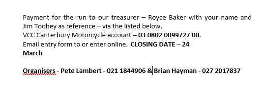 By the time you read this, we will have had the Brooklands to Brighton Run for our 100+ year old vehicles, and then for many it’s off to Nelson for the Vero Festival of Historic Motoring. Look for the reports in next Hub. There will be no organised Veteran Coffee Morning at Kirwee during March, nor a Random Run, due to the Vero FHM.