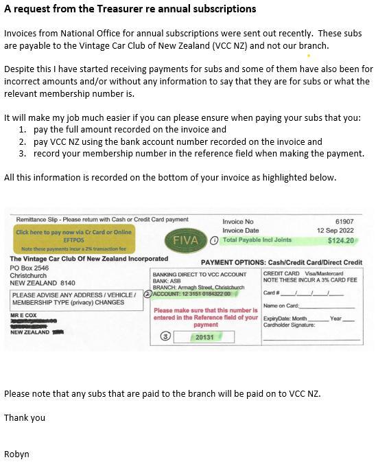 Member subscriptions due end of this month, so if you have provided an email address your invoice would have been sent beginning of September. If you still have not received it by email or post contact National office urgently on 03 366 4461. 9-30 to 1.30pm or email <admin@vcc.org.nz last resort you could try posting but don't hold your breath. Be very careful you pay your subscription to VCC National Office account (12-3151-0184322-00). Include membership number/ Name. DO NOT PAY TO CANTERBURY BRANCH ACCOUNT.