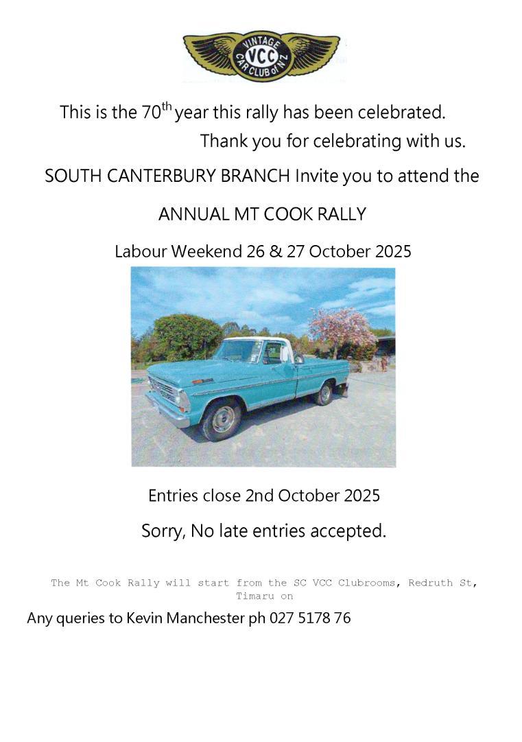 Weekend of 14th and 15th February - Mid-Summer Adventures, Geraldine. Registration forms will be in the next Veteran Car Club Bulletin, or if you don’t subscribe to that, please contact Colin Hey if you’re interested in going. In the meantime we suggest you book your accommodation as soon as possible as Geraldine is a popular destination at that time of the year.