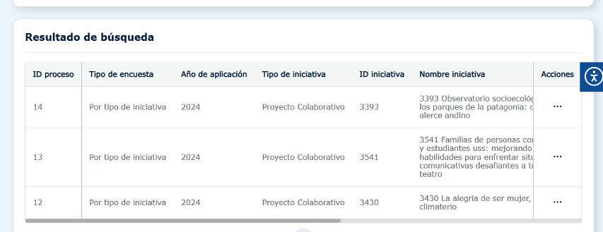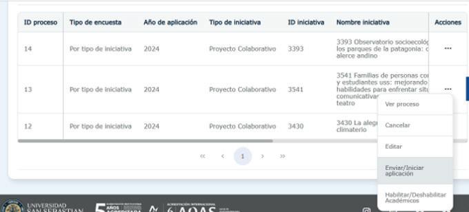 El proceso de aplicación creado aparecerá listado en el buscador “Consultar aplicación de encuestas”. Para iniciar la aplicación deberás ingresar al botón “acciones”, ubicado al lado izquierdo del proceso creado y presionar el botón “Enviar/iniciar aplicación”, que te permitirá enviar por correo electrónico la encuesta a los estudiantes de la asignatura, si la modalidad es online; o descargar el código QR para utilizarlo si la aplicación es presencial.