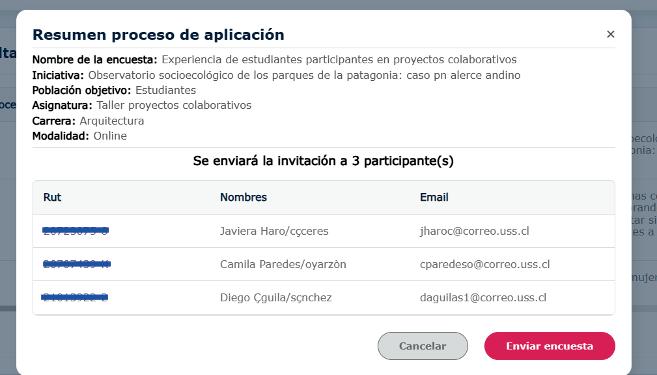 Aplicar tanto vía correo electrónico como de manera presencial (mediante un código QR), las encuestas disponibles en la plataforma para evaluar una iniciativa de VcM desde la perspectiva de los diferentes actores involucrados: estudiantes, académicos y organizaciones externas.