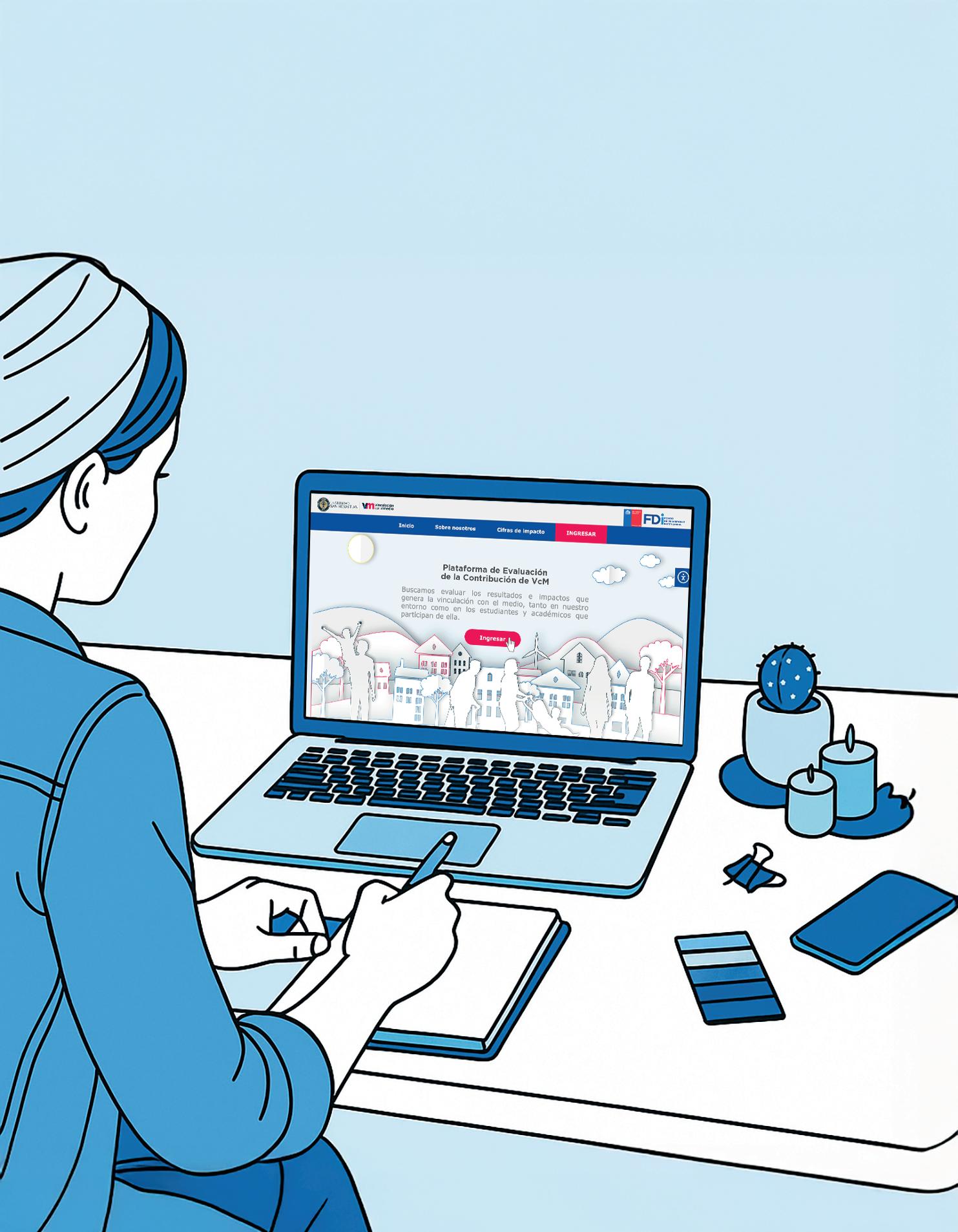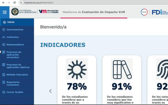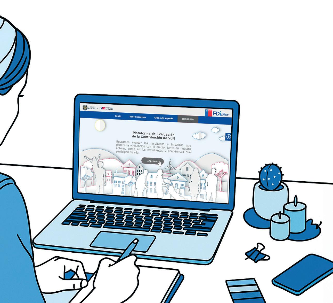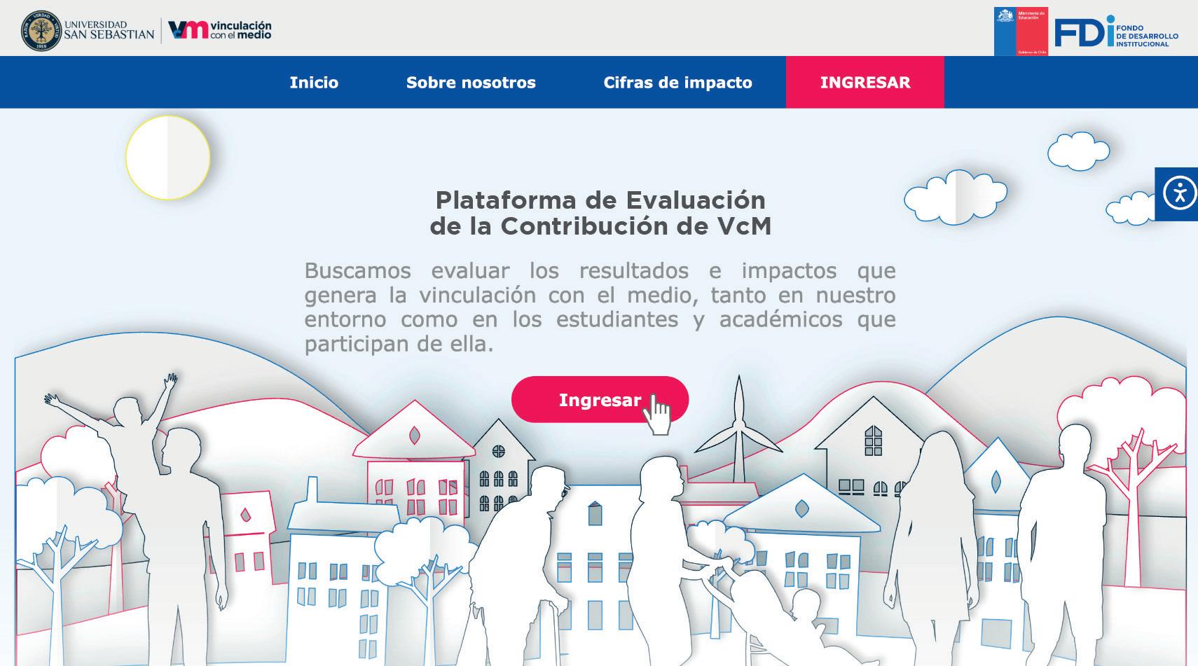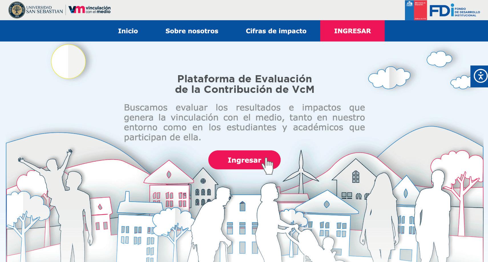 Para facilitar lo anterior e impulsar la implementación del Sistema Integrado de Evaluación de la Contribución e impacto de la VcM¹, se pone a disposición la Plataforma de Evaluación de la Contribución de VcM, la cual permite a los académicos aplicar instrumentos que indaguen la percepción de los actores participantes y el grado de cumplimiento de los resultados e impactos esperados de la VcM en la USS, establecidos en el Modelo de Evaluación de la Contribución e Impacto VcM USS² .