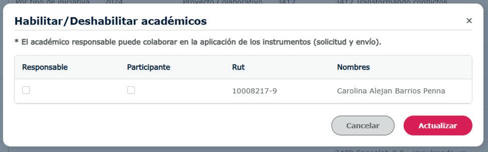 Adicionalmente, con el botón “Agregar académicos” que aparecerá dentro del modal, puedes elegir de manera opcional entre de los académicos participantes de tu proyecto, a quién o quiénes puedan colaborar enviando o iniciando el proceso de aplicación creado y/o efectuando su monitoreo. Esto se realiza marcando la opción “responsable”, si deseas que puedan iniciar y monitorear el proceso creado, o “participante” si deseas que solo puedan monitorear.