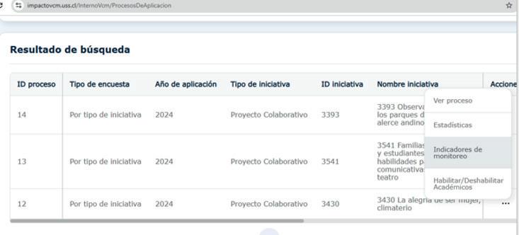 La plataforma te permite monitorear las tasas de respuesta de la aplicación. Para acceder a este monitoreo debes presionar el botón “Acciones/Indicadores de monitoreo”.