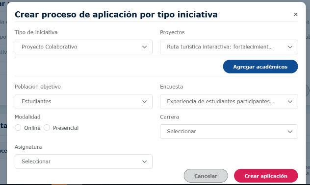 Además, se puede crear más de un proceso de aplicación para cada asignatura de un proyecto, pero solo “uno” por cada “modalidad”: online y presencial. Es decir, si se aplicó la modalidad presencial, pero esta no tuvo los resultados esperados, se puede complementar con un proceso online y viceversa. Sin embargo, solo se podrá generar “1” proceso presencial y “1” online por asignatura, y se deberá controlar que los estudiantes no contesten más de una vez la encuesta para un mismo proyecto.