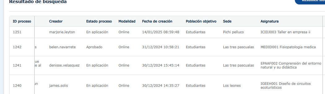 Para facilitar la identificacion de cada proceso creado, se incorporó el código de la asignatura tanto en el buscador como en la creación de procesos de aplicación.
