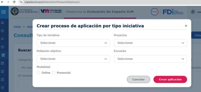 A continuación, deberás completar la información específica para configurar el proceso de aplicación de la encuesta (imagen 2.3). Si eres académico líder debes programar un proceso para cada una de las asignaturas participantes en el proyecto, siempre en coordinación con el profesor que dicta la asignatura y con el apoyo del equipo de VcM sede.