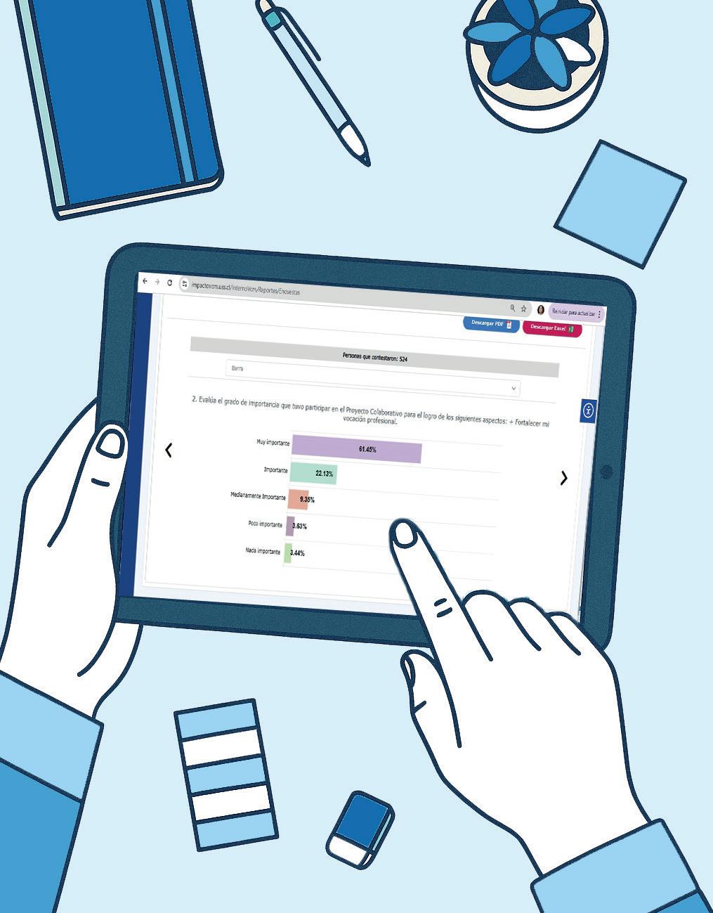 Una vez finalizado el proceso completo de aplicación, revisar los resultados de la encuesta en general (de forma agregada) y por proyecto³, accediendo a reportería descargable y configurable ad hoc de acuerdo con las necesidades del usuario.