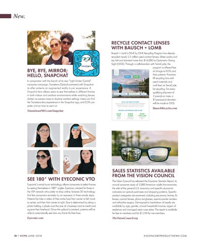 BYE, BYE, MIRROR; HELLO, SNAPCHAT In conjunction with the launch of its new “Light Under Control” consumer campaign, Transitions Optical partnered with Snapchat to offer patients an augmented reality try-on experience. A Snapchat lens allows users to see themselves in different frames in both indoor and outdoor environments while watching lenses darken as scenes move to daytime outdoor settings. Users can find the Transitions lens experience in the Snapchat app, and ECPs can order a kit on how to use it at