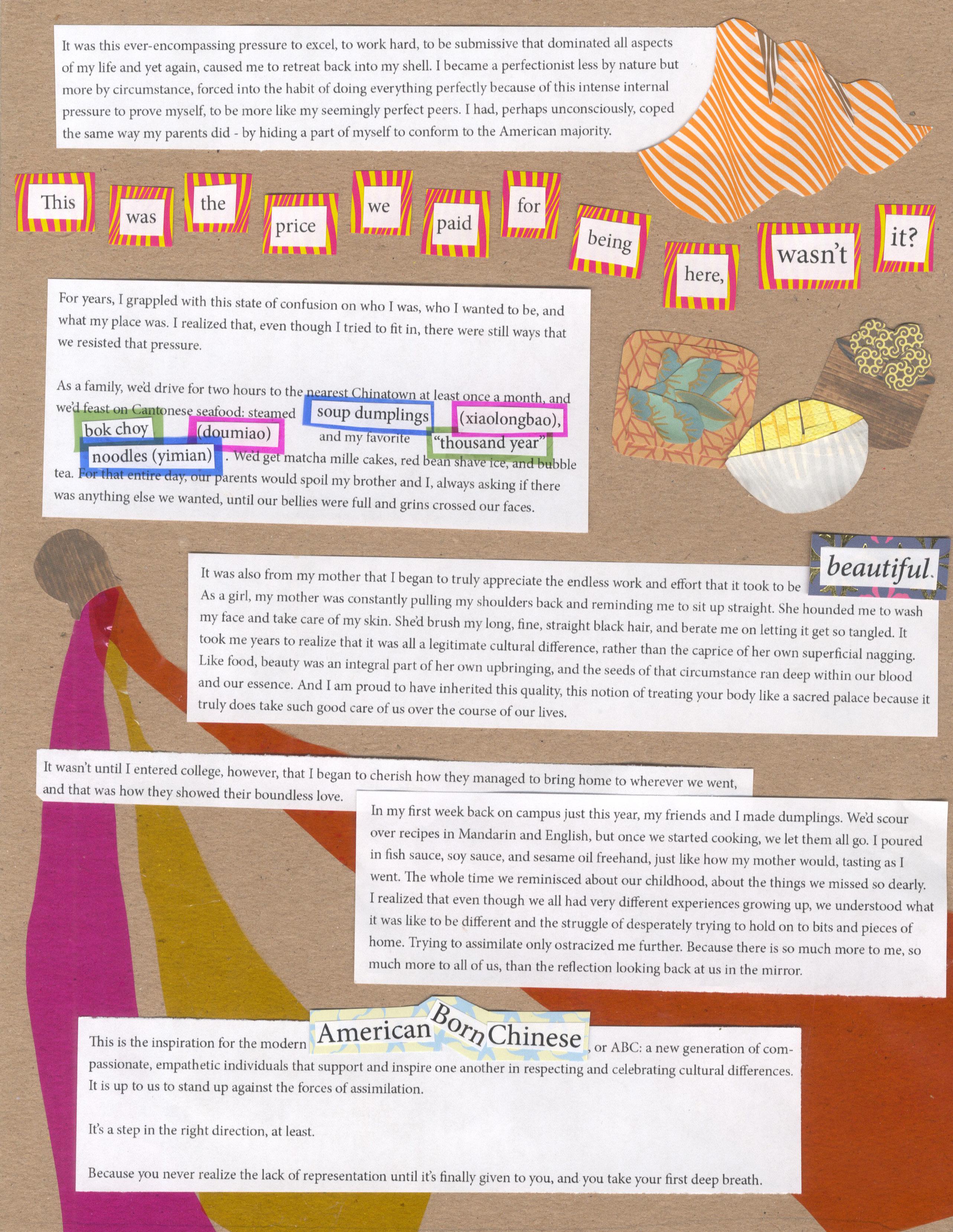 The reflection, the other half of it, isn’t much better, now is it? I can’t look in the mirror without being reminded of how Asian I look. During my time as a host at a sushi restaurant, the number of times I was confused for the owner’s son must be in the dozens. It’s a tiny thing, but it’s the example that always comes to mind. One of us is fully Chinese; the other is not. And, no, we do not look alike. “Passing isn’t something that’s doable, and it’s always a strange experi ence being made into an “other” in the town I’ve grown up in.