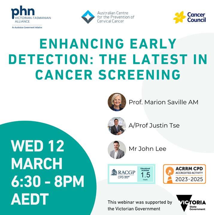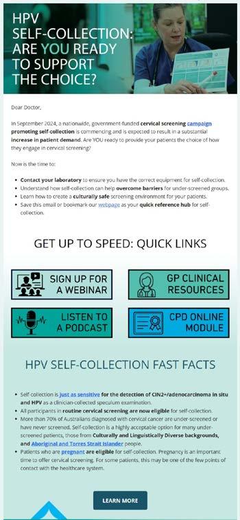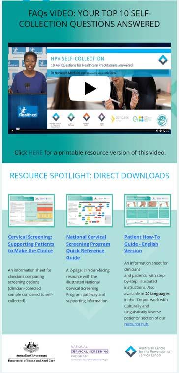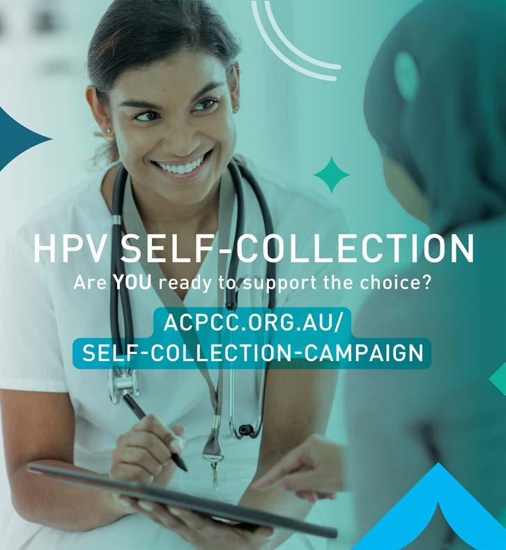 The 2022 introduction of universal selfcollection has been a game-changer in testing for HPV. It has increased engagement and satisfaction with screening, especially for those in regional areas, people with disabilities, and Aboriginal and Torres Strait Islander communities. In September 2024, a nationwide campaign promoting self-collection was launched. As demand grew exponentially the ACPCC led the expert group with resources and training to help support Australian health care providers in offering patients more choice in how they engage with cervical screening.
