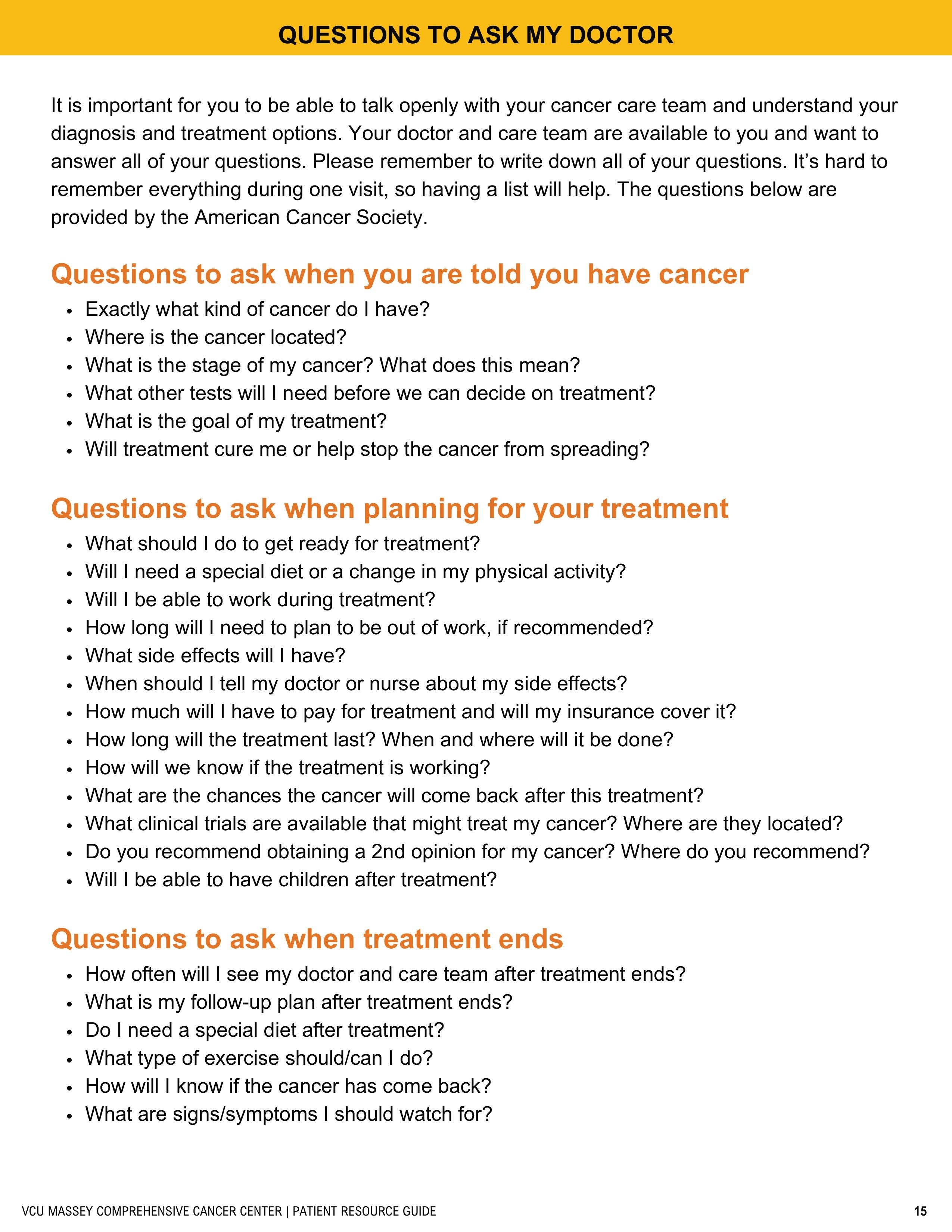 Itisimportantforyoutobeabletotalkopenlywithyourcancercareteamandunderstandyour diagnosisandtreatmentoptions.Yourdoctorandcareteamareavailabletoyouandwantto answerallofyourquestions.Pleaseremembertowritedownallofyourquestions.It'shardto remembereverythingduringonevisit,sohavingalistwillhelp.Thequestionsbeloware providedbytheAmericanCancerSociety.