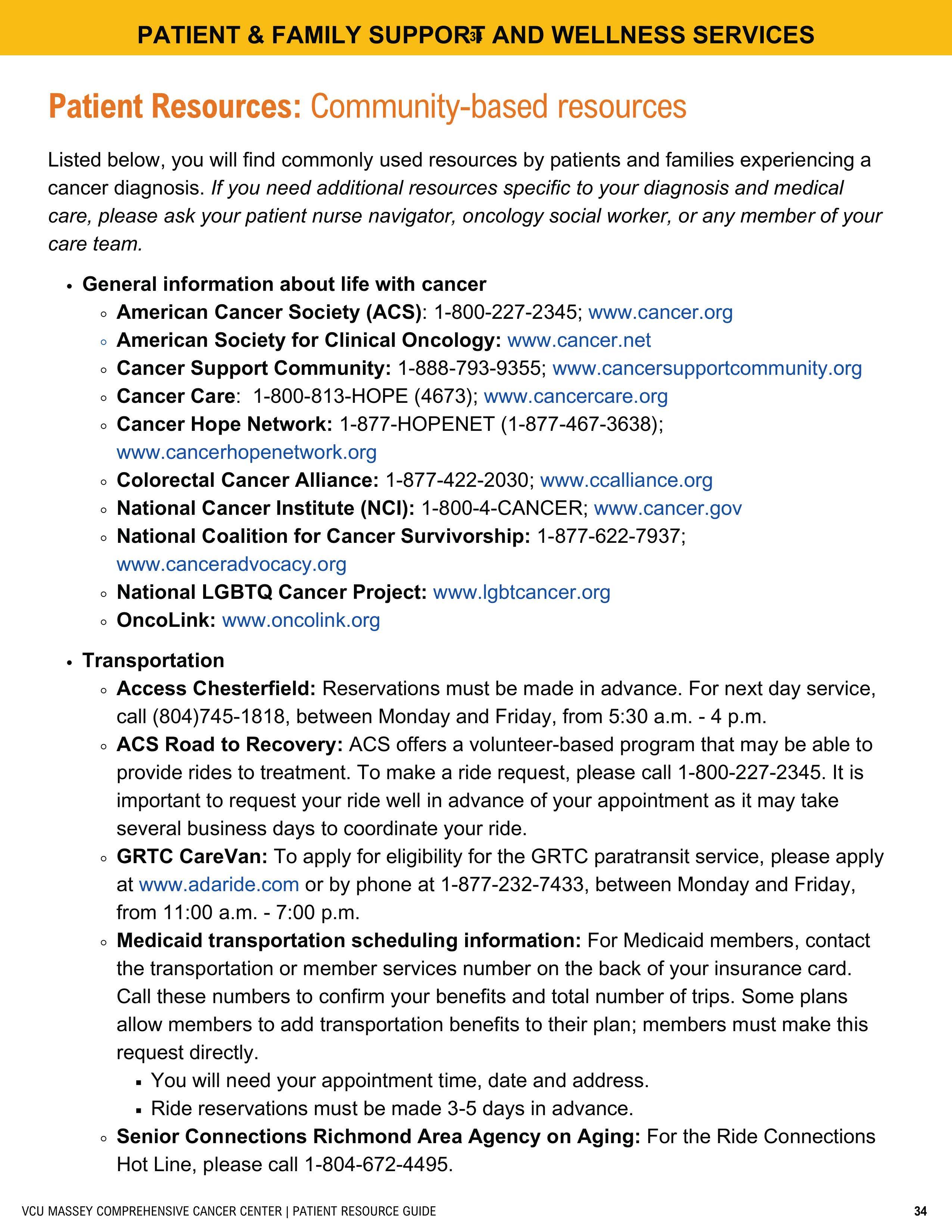 Listedbelow,youwillfindcommonlyusedresourcesbypatientsandfamiliesexperiencinga cancerdiagnosis. If you need additional resources specific to your diagnosis and medical care, please ask your patient nurse navigator, oncology social worker, or any member of your care team .