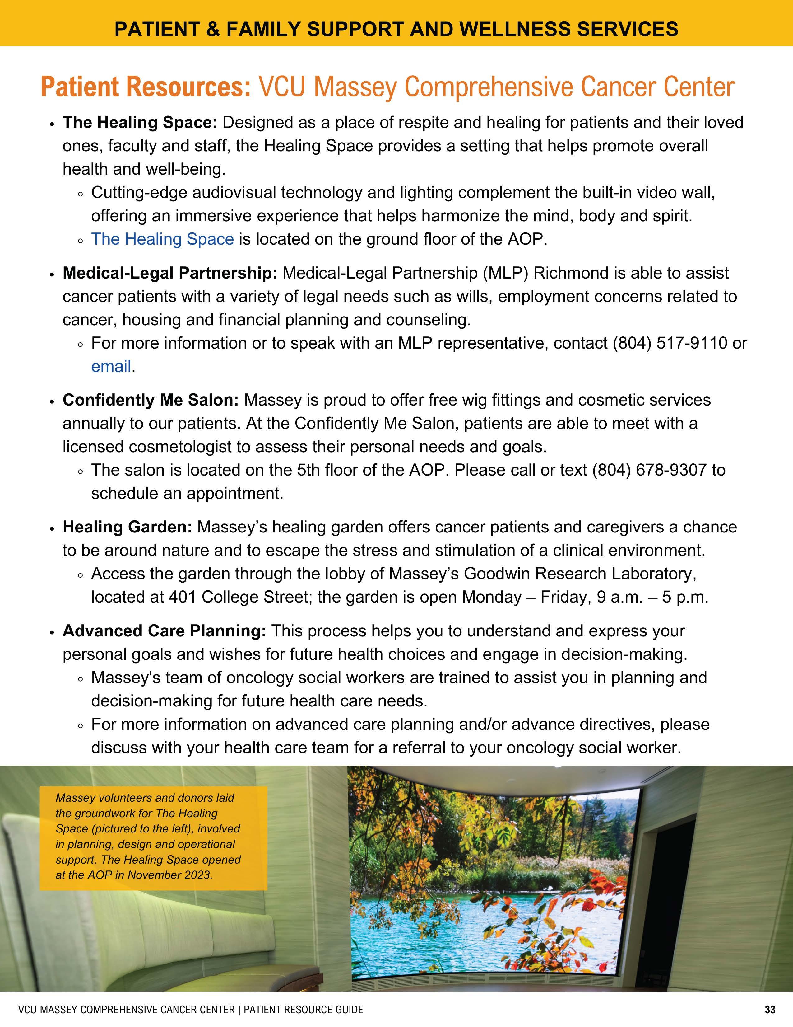 • TheHealingSpace: Designedasaplaceofrespiteandhealingforpatientsandtheirloved ones,facultyandstaff,theHealingSpaceprovidesasettingthathelpspromoteoverall healthandwell-being.