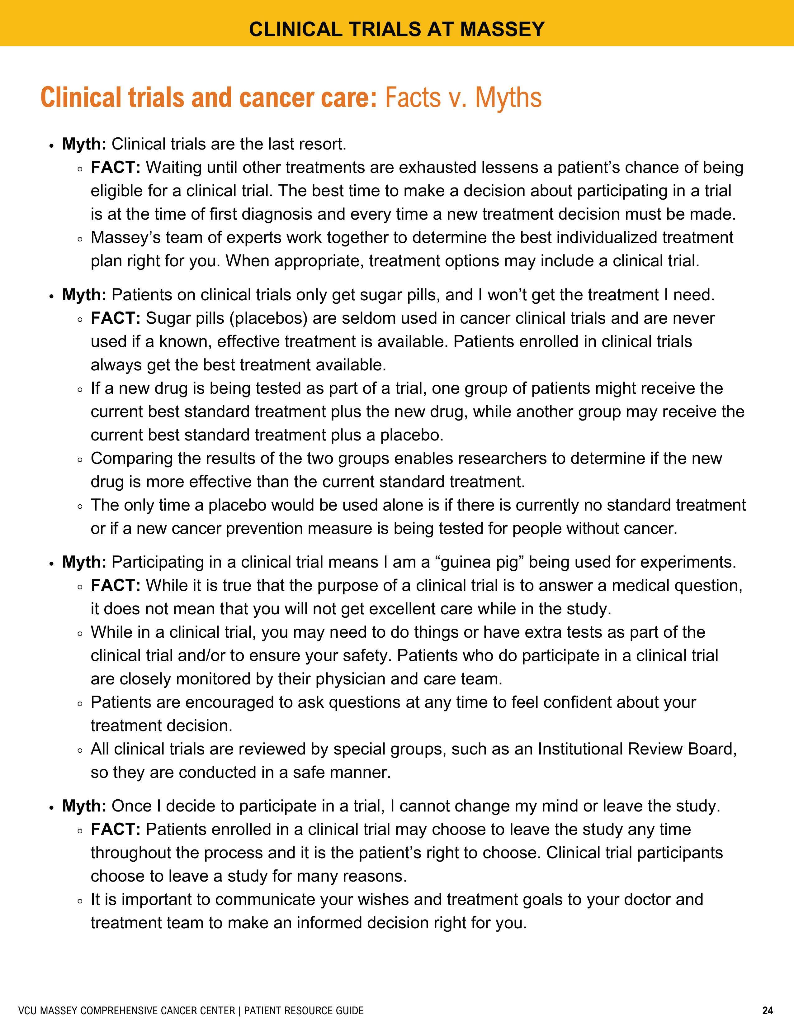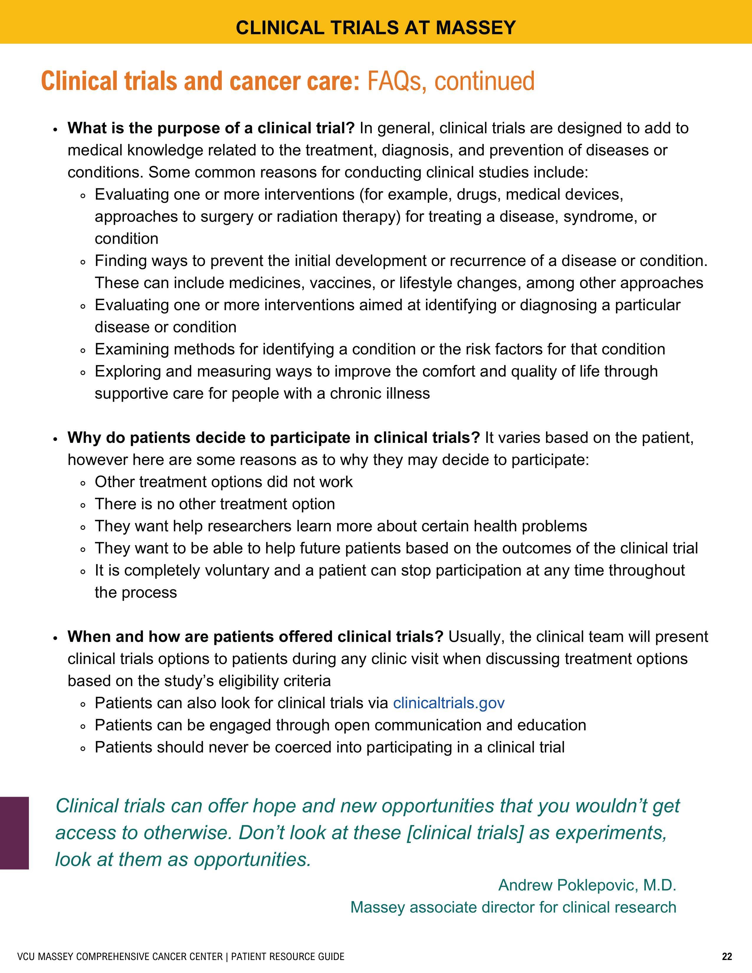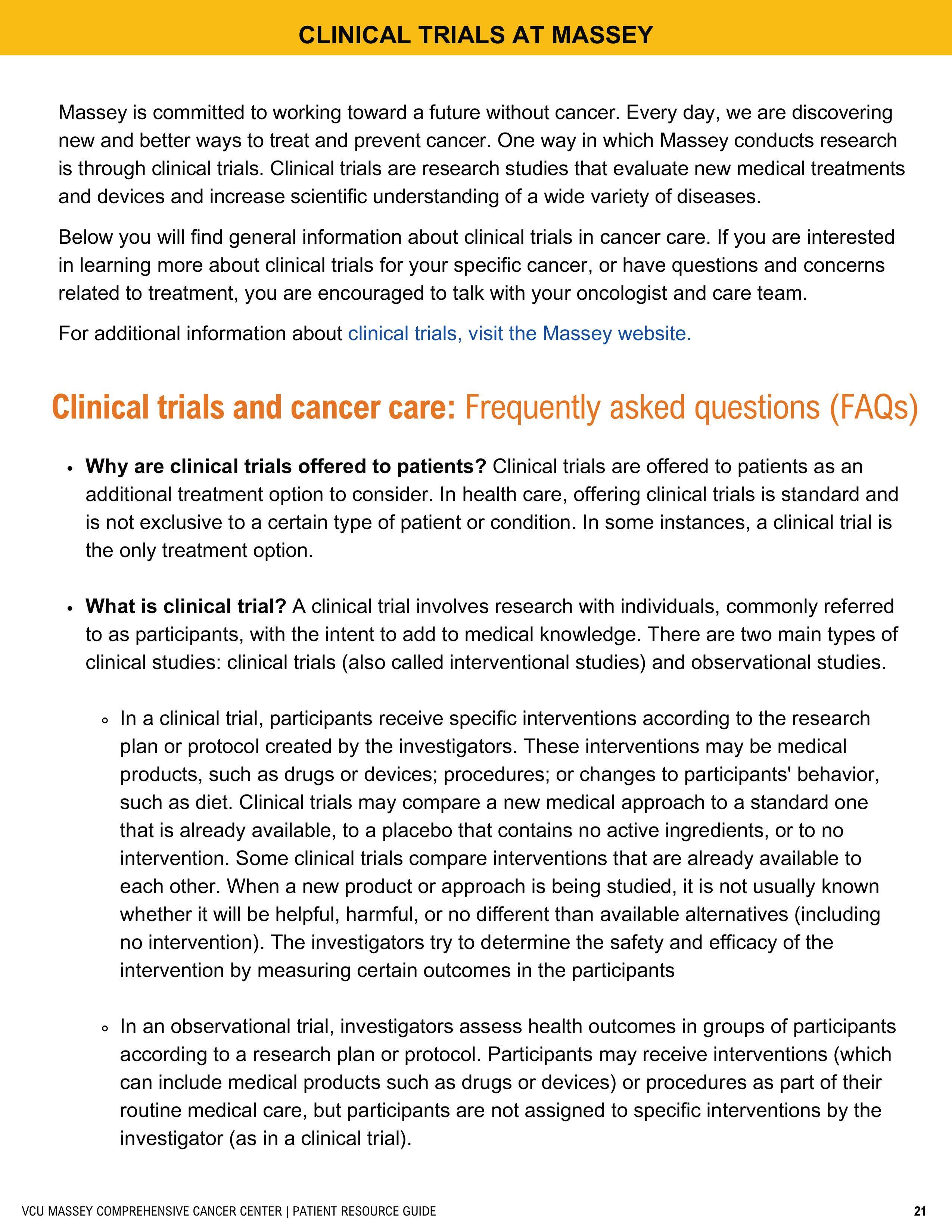 Ourscopeoftreatmentsandservicesincludescutting-edgeclinicaltrials,offering tomorrow'sstandardsofcaretotoday'spatients.Clinicaltrialsprovideadditionaloptions acrossthecontinuumofcare.Theyalsoofferhopeandassurancetopatientsthat,no matterthetypeorseverityofthedisease,Masseycanandwilldeliverfirst-class, individualizedcancercare.