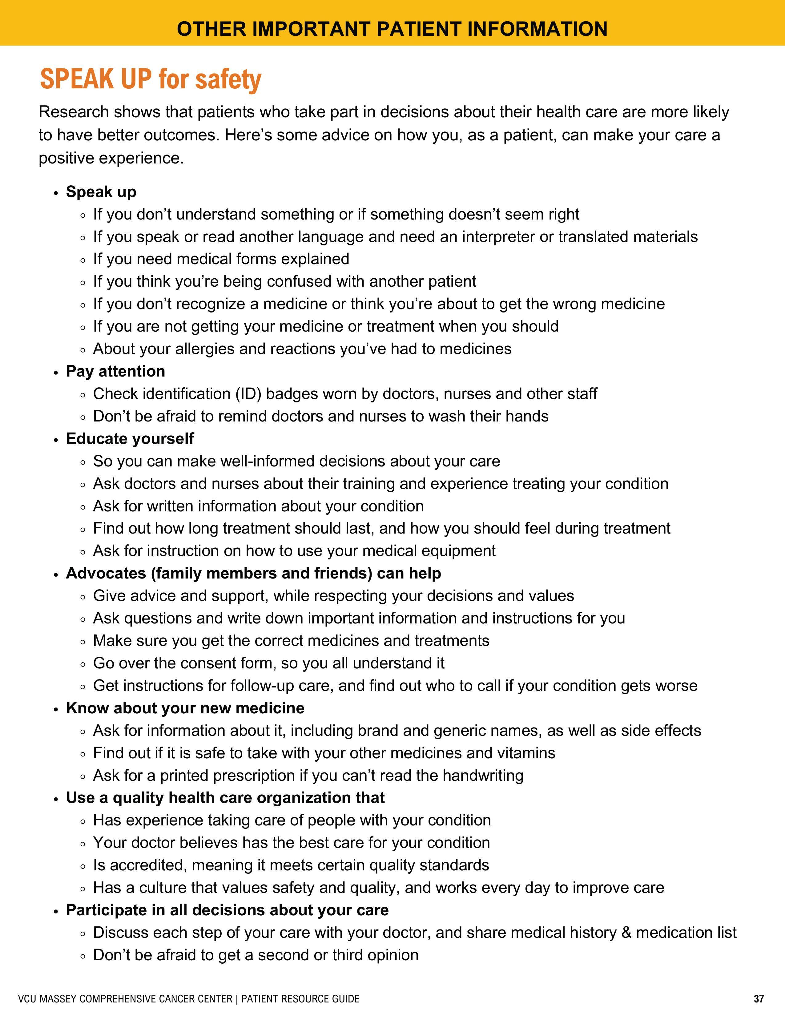 AtMassey,weencouragepatientstoofferinput,askquestionsandexpressconcernstoyour doctorandtreatmentteam.Playinganactiveroleindevelopingyourtreatmentplancan promoteabetterexperiencethroughoutyourcancerjourney.