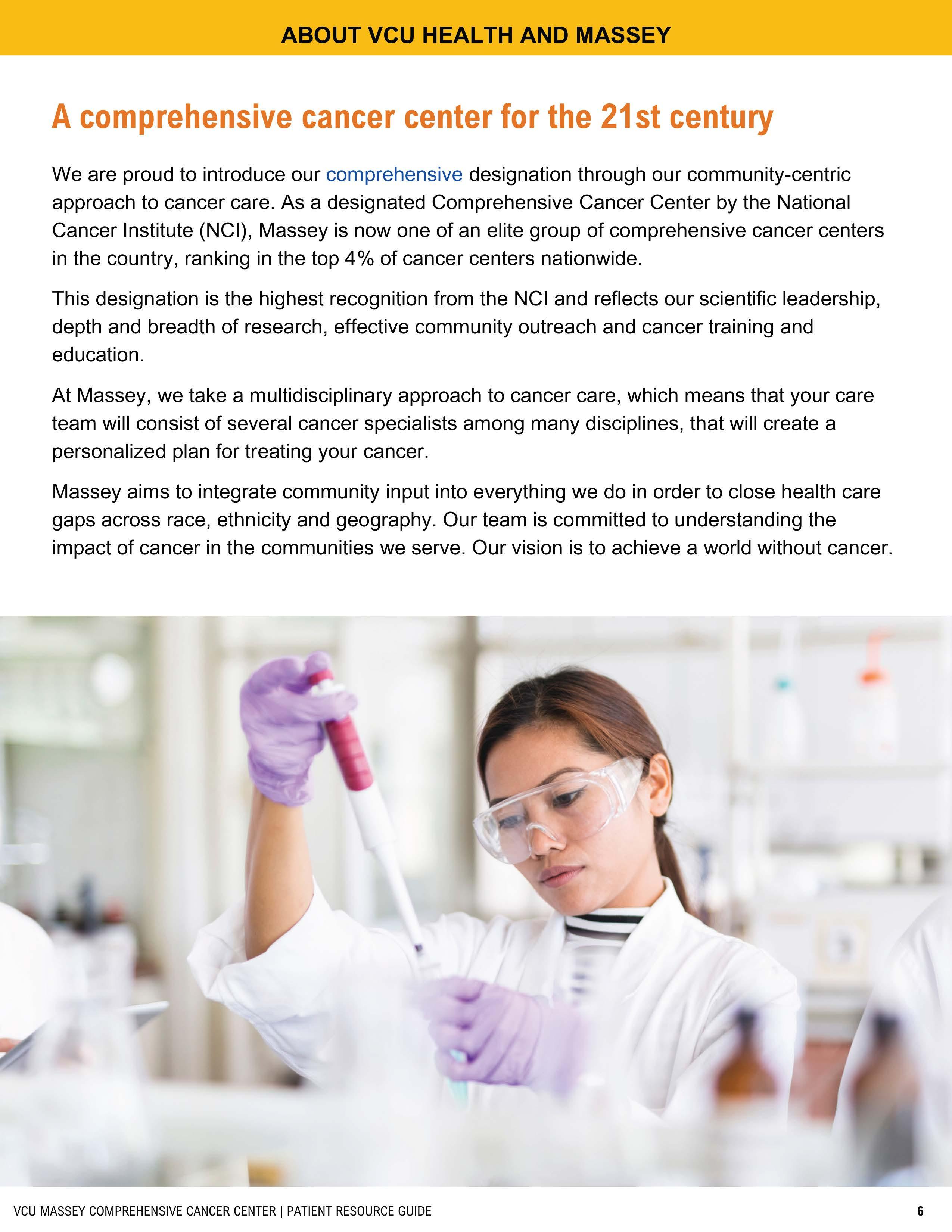 WelcometoVCUMasseyComprehensiveCancerCenter,thefirstinanewgenerationof cancercentersthatintegratesthecommunity'sneedsineverythingwedo-fromthe researchlaboratorytothetreatmentroom.