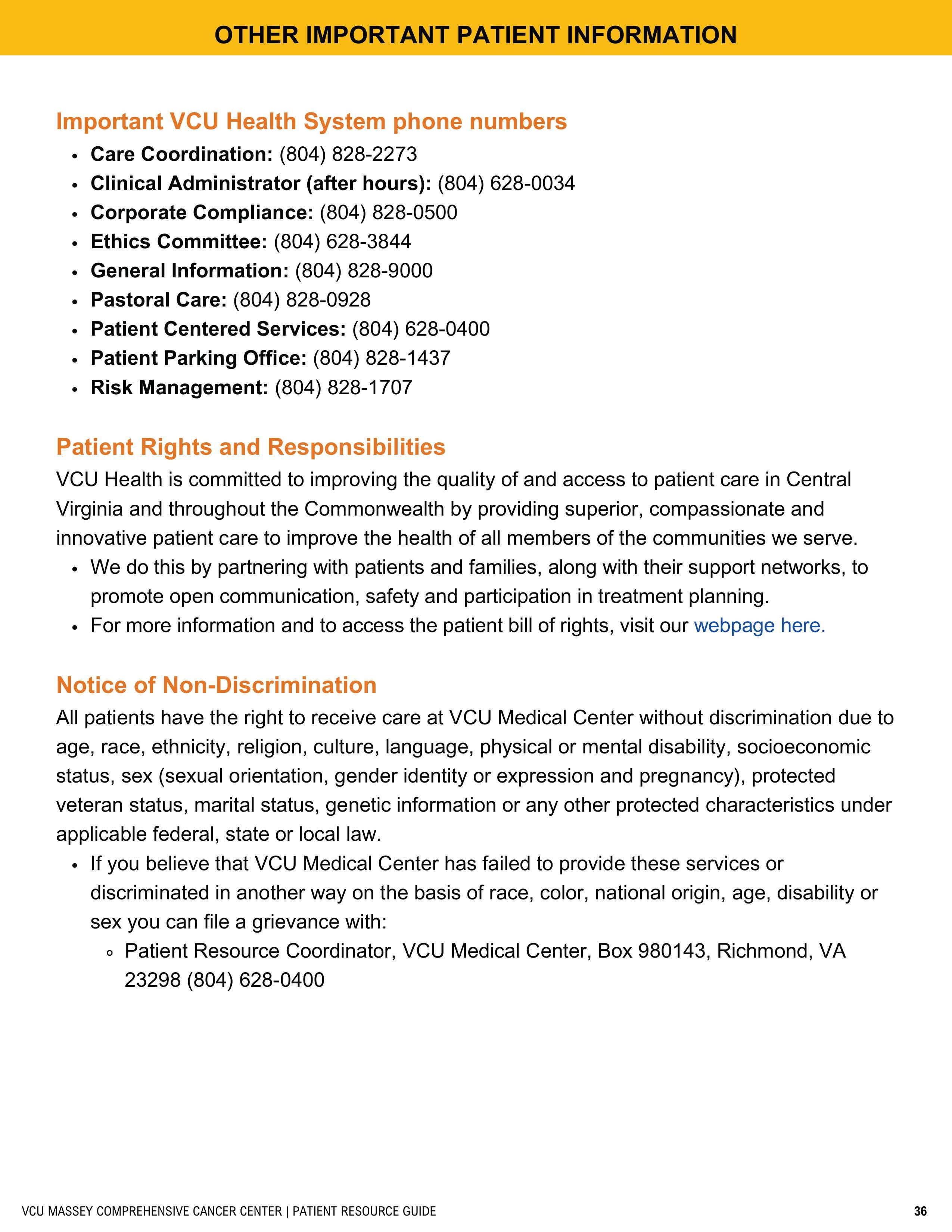 AllpatientshavetherighttoreceivecareatVCUMedicalCenterwithoutdiscriminationdueto age,race,ethnicity,religion,culture,language,physicalormentaldisability,socioeconomic status,sex(sexualorientation,genderidentityorexpressionandpregnancy),protected veteranstatus,maritalstatus,geneticinformationoranyotherprotectedcharacteristicsunder applicablefederal,stateorlocallaw.