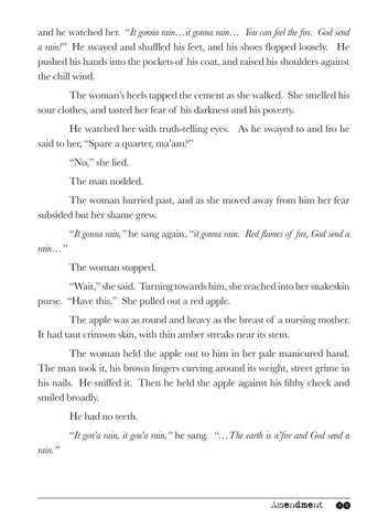 Thewind.woman’s heels tapped the cement as she walked. She smelled his sour clothes, and tasted her fear of his darkness and his poverty. He watched her with truth-telling eyes. As he swayed to and fro he said to her, “Spare a quarter, ma’am?” “No,” she lied. The man nodded. The woman hurried past, and as she moved away from him her fear subsided but her shame grew. “It gonna rain,” he sang again, “it gonna rain. Red flames of fire, God send a rain…” The woman stopped. “Wait,” she said. Turning towards him, she reached into her snakeskin purse. “Have this.” She pulled out a red apple. The apple was as round and heavy as the breast of a nursing mother. It had taut crimson skin, with thin amber streaks near its stem. The woman held the apple out to him in her pale manicured hand. The man took it, his brown fingers curving around its weight, street grime in his nails. He sniffed it. Then he held the apple against his filthy cheek and smiled broadly.Hehad no teeth. “It gon’a rain, it gon’a rain,” he sang. “…The earth is a’fire and God send a rain.”