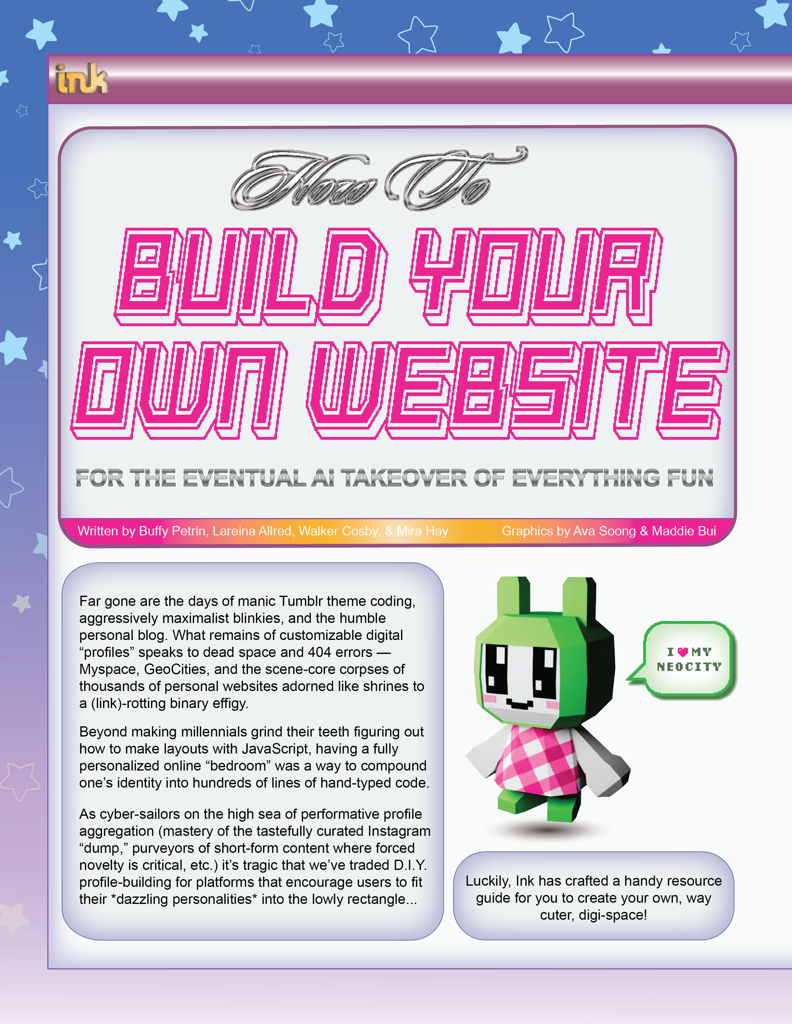I’ve been a part of Ink Magazine since my freshman year of college. I started as a writer, bright-eyed and clueless because I was 18 and still convinced the world needed to hear my opinion on everything. I had no idea that a few years later, I would have the privilege of becoming Editor-in-Chief. It’s become one of the most rewarding experiences of my life. (I’ve also been campaigning for a cyber issue for two years, so I’m a little biased when I say that I think this is our best issue yet.) But a magazine is not an isolated effort. A publication of this scale wouldn’t be possible without our staff: a group of endlessly eager, chronically online, beautiful, smart people. I couldn’t be prouder of them. They’ve spent months of their lives creating this issue. I hope that as you read, you feel it. Our love. Our fear. Our passion. And you let it move you.