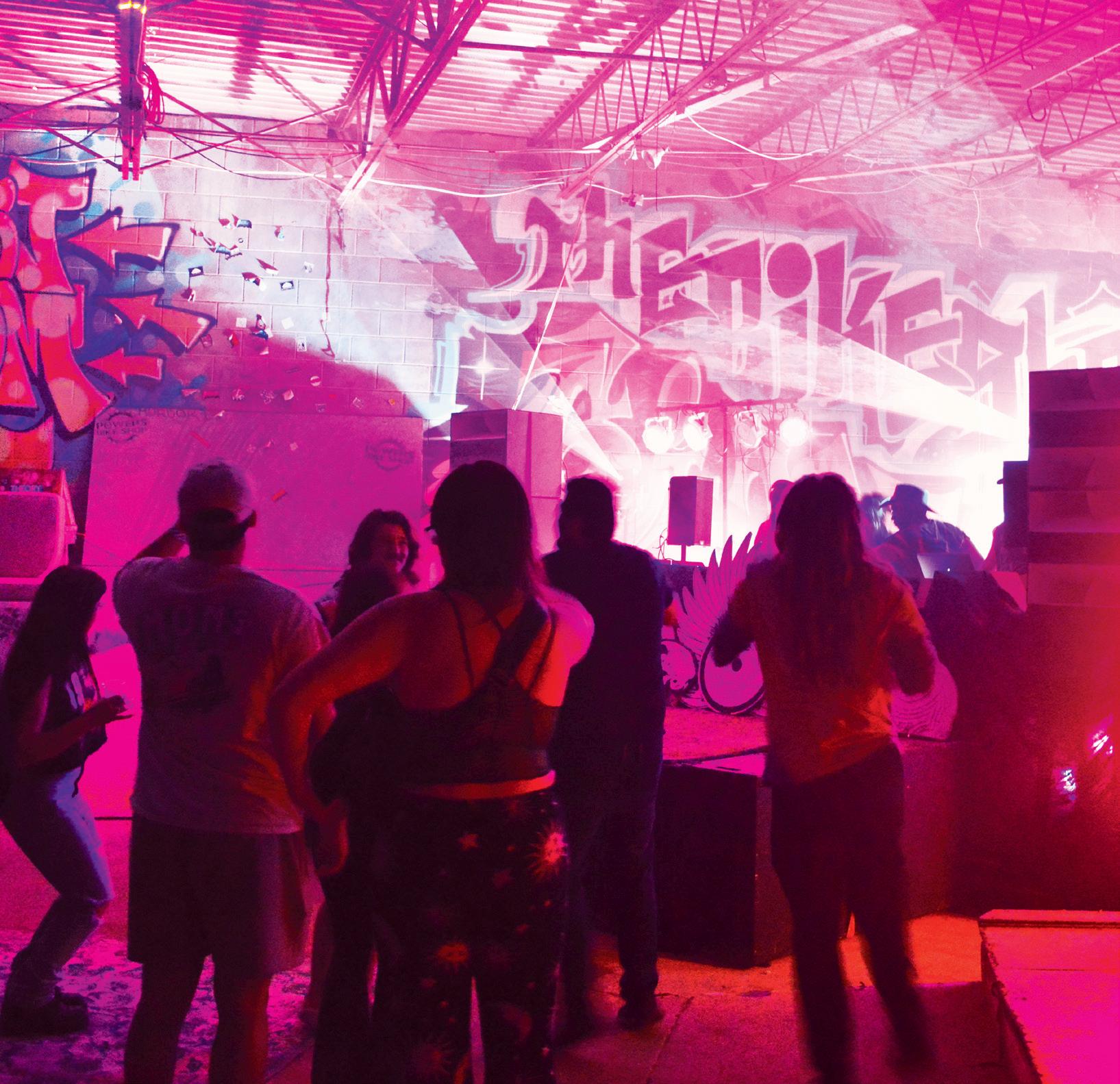 The rave was held at Powers BMX Shop, where bike ramps for bunny hops and tail whips the garage are turned into DJ stands, and the space outside is used as a stage for fire spinners and local artists.