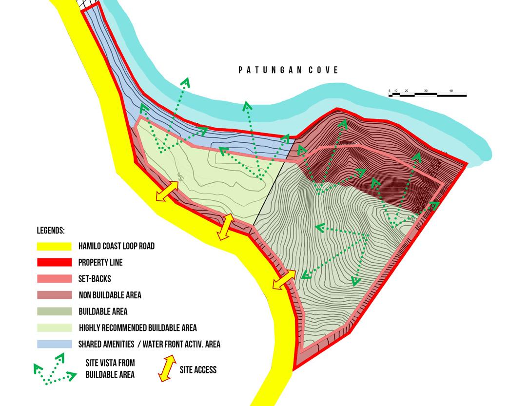 Initial Zoning Analysis Site Slope Analysis Initial Development Analysis Zoning and Massing Studies Hamilo Coast Loop Road Hamilo Loop Road Property Line Set-Back Site View from Loop Road Site Vista North-East Moonsoon South-West Moonsoon Property Line Set-Backs 2-5% Very Gentle Slope 5-9% Gentle Slope 5-9% Gentle Slope 9-15% Moderate Slope 15-30% Strong Slope Hamily Coast Loop Road Hamily Coast Loop Road Property Line Set-Backs Hotel & Accommodation Area Eco-Tourism Activity Area Reserved Flora & Fauna Area Shared Amenities / Activity Area Property Line Set-Back Non-Buildable Area Buildable Area Highly Recommended Area Shared Amenities / Activity Area Site-Vista From Buildable Area Site Access