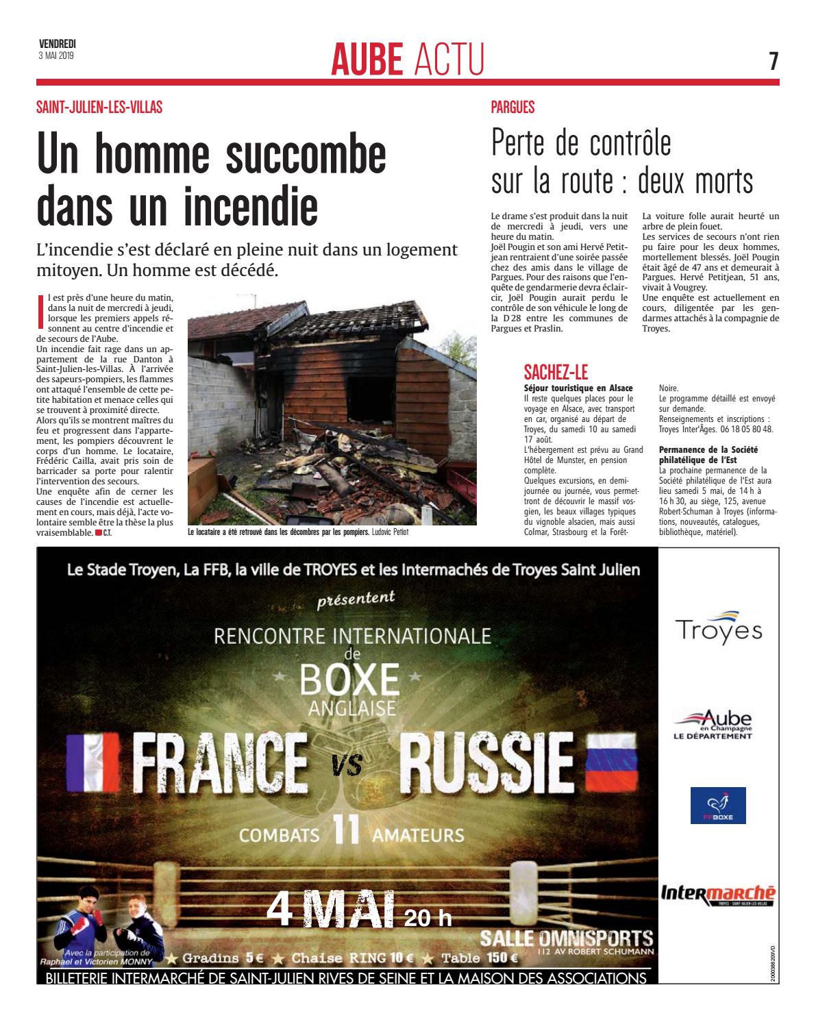 L’incendie s’est déclaré en pleine nuit dans un logement mitoyen. Un homme est décédé. l est près d’une heure du matin, dans la nuit de mercredi à jeudi, lorsque les premiers appels résonnent au centre d’incendie et de secours de l’Aube. Un incendie fait rage dans un appartement de la rue Danton à Saint-Julien-les-Villas. À l’arrivée des sapeurs-pompiers, les flammes ont attaqué l’ensemble de cette petite habitation et menace celles qui se trouvent à proximité directe. Alors qu’ils se montrent maîtres du feu et progressent dans l’appartement, les pompiers découvrent le corps d’un homme. Le locataire, Frédéric Cailla, avait pris soin de barricader sa porte pour ralentir l’intervention des secours. Une enquête afin de cerner les causes de l’incendie est actuellement en cours, mais déjà, l’acte volontaire semble être la thèse la plus vraisemblable. C.T.