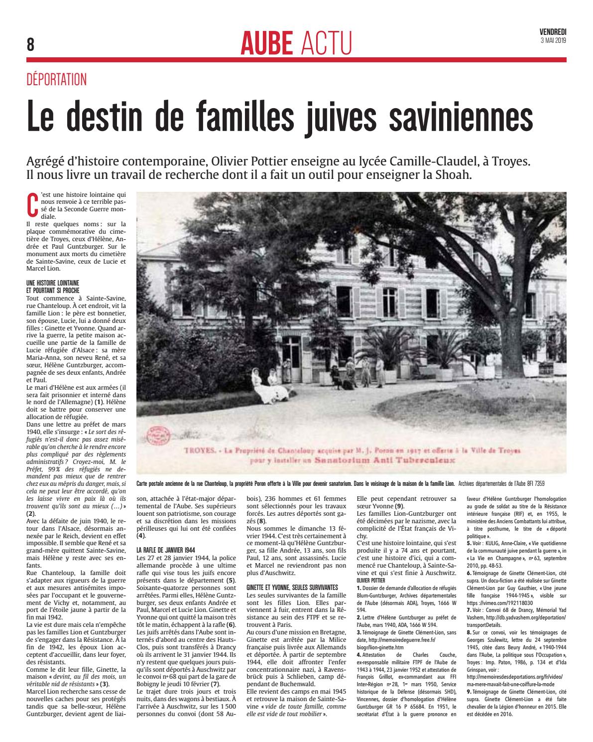 Le destin de familles juives saviniennes Agrégé d’histoire contemporaine, Olivier Pottier enseigne au lycée Camille-Claudel, à Troyes. Il nous livre un travail de recherche dont il a fait un outil pour enseigner la Shoah. ’est une histoire lointaine qui nous renvoie à ce terrible passé de la Seconde Guerre mondiale. Il reste quelques noms : sur la plaque commémorative du cimetière de Troyes, ceux d’Hélène, Andrée et Paul Guntzburger. Sur le monument aux morts du cimetière de Sainte-Savine, ceux de Lucie et Marcel Lion.