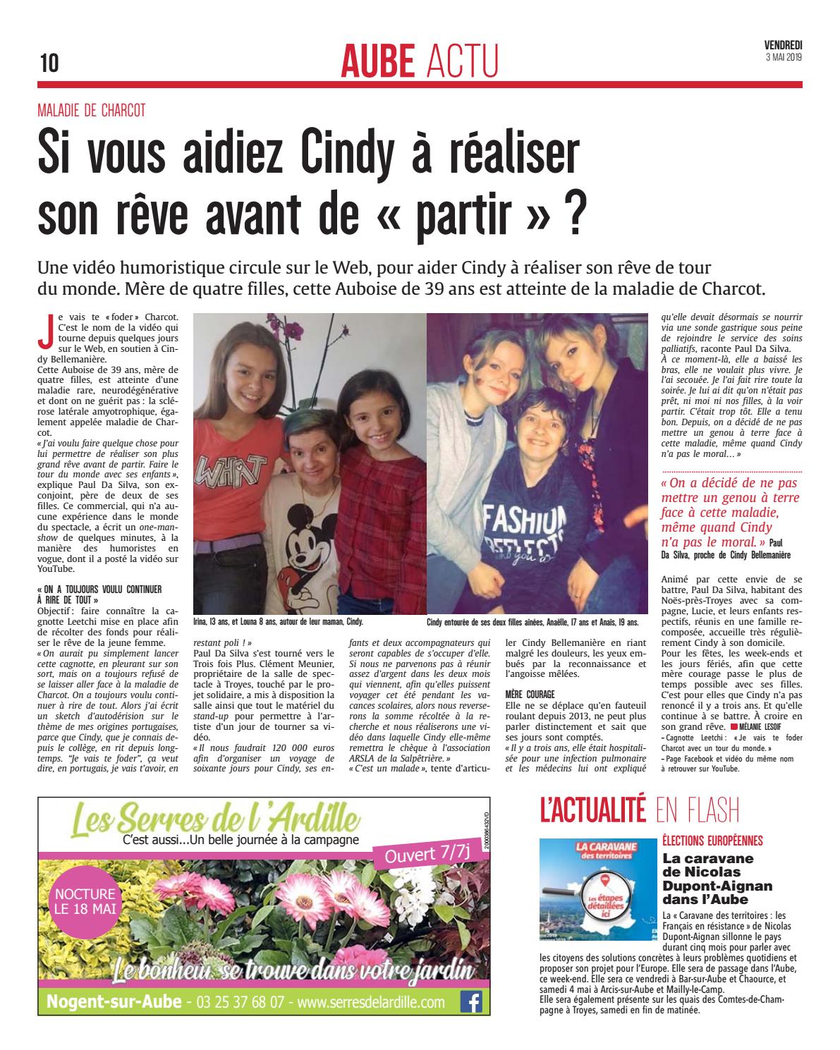 Si vous aidiez Cindy à réaliser son rêve avant de « partir » ? Une vidéo humoristique circule sur le Web, pour aider Cindy à réaliser son rêve de tour du monde. Mère de quatre filles, cette Auboise de 39 ans est atteinte de la maladie de Charcot. qu’elle devait désormais se nourrir via une sonde gastrique sous peine de rejoindre le service des soins palliatifs, raconte Paul Da Silva. À ce moment-là, elle a baissé les bras, elle ne voulait plus vivre. Je l’ai secouée. Je l’ai fait rire toute la soirée. Je lui ai dit qu’on n’était pas prêt, ni moi ni nos filles, à la voir partir. C’était trop tôt. Elle a tenu bon. Depuis, on a décidé de ne pas mettre un genou à terre face à cette maladie, même quand Cindy n’a pas le moral… »