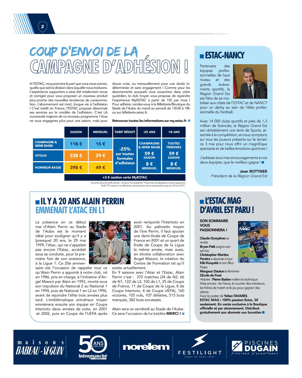 Claude Gonçalves se révèle Bryan Pelé soigne son service Christopher Martins Pereira a réponse à tout Kiki Kouyaté et son Illico Pesto Margaux Dautun la féminine L’Ecole de Foot Histoire : Pierre Baden maître ès technique Mais encore : les News, le courrier des e-lecteurs, les fiches de match et le jeu pour gagner des places. Avec le poster de Yohan TAVARES. ESTAC MAG : 100% passion Estac, 3€ seulement. En vente exclusive à la Boutique officielle et par abonnement. Distribué gratuitement aux abonnés aux buvettes