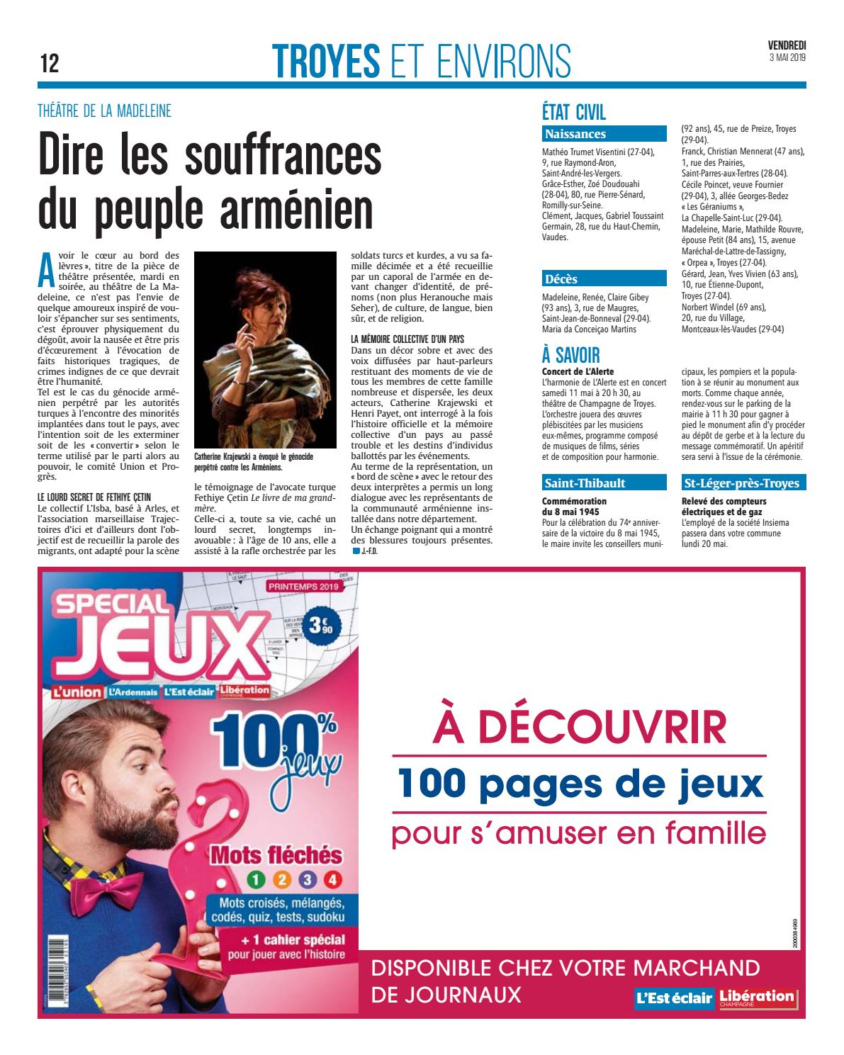 Catherine Krajewski a évoqué le génocide perpétré contre les Arméniens. le témoignage de l’avocate turque Fethiye Çetin Le livre de ma grandmère. Celle-ci a, toute sa vie, caché un lourd secret, longtemps inavouable : à l’âge de 10 ans, elle a assisté à la rafle orchestrée par les
