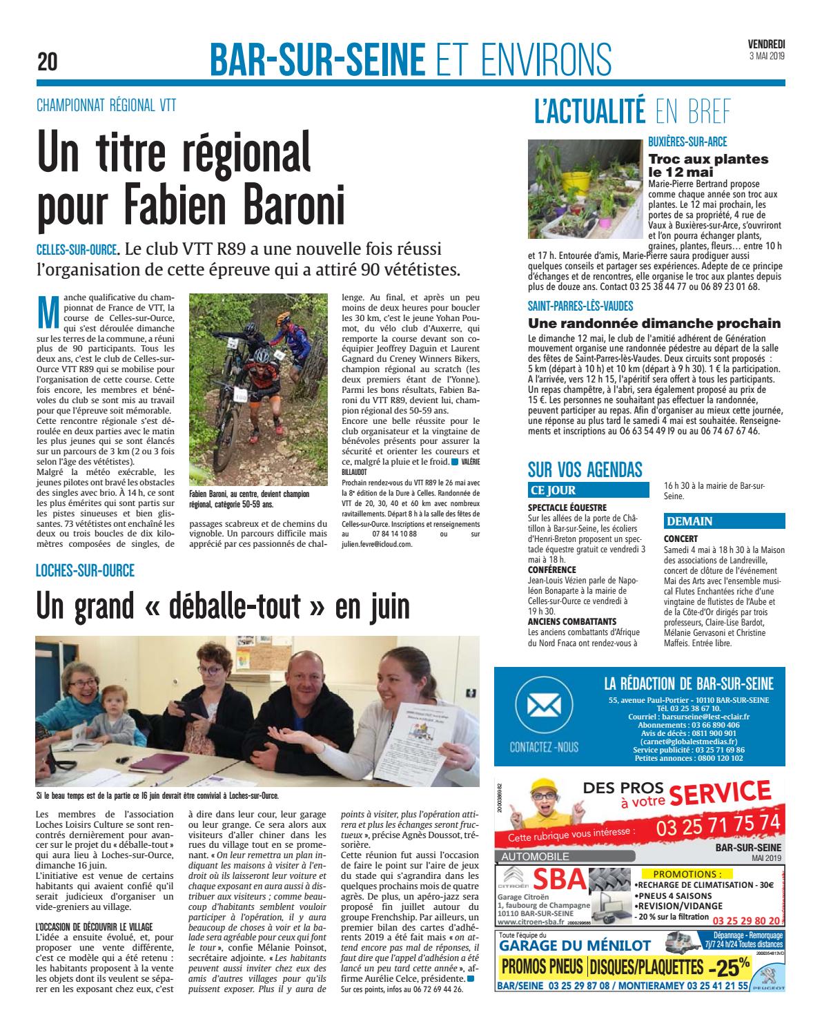 Prochain rendez-vous du VTT R89 le 26 mai avec la 8e édition de la Dure à Celles. Randonnée de VTT de 20, 30, 40 et 60 km avec nombreux ravitaillements. Départ 8 h à la salle des fêtes de Celles-sur-Ource. Inscriptions et renseignements au 07 84 14 10 88 ou sur julien.fevre@icloud.com.