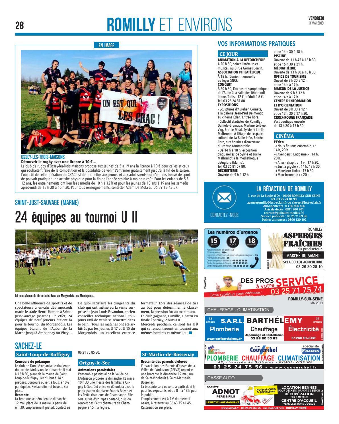 LA RÉDACTION DE ROMILLY 3, rue de La Boule-d’Or - 10100 ROMILLY-SUR-SEINE Tél. 03 25 24 81 99. agenceromilly@lest-eclair.fr ou clevert@lest-eclair.fr Abonnements : 03 66 890 406 Avis de décès : 0811 900 901 (carnet@globalestmedias.fr) Service publicité : 03 25 71 69 86 Petites annonces : 0800 120 102