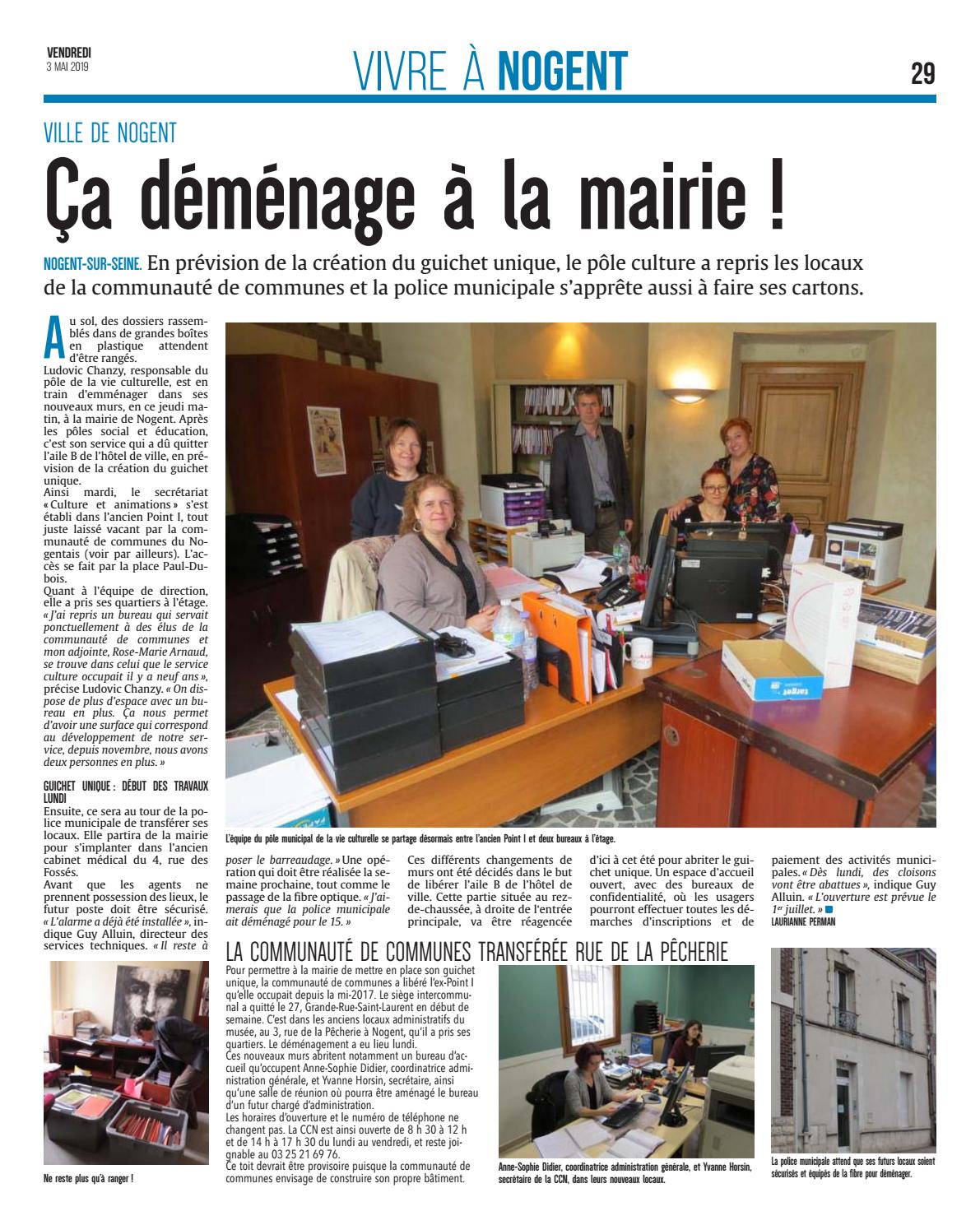 u sol, des dossiers rassemblés dans de grandes boîtes en plastique attendent d’être rangés. Ludovic Chanzy, responsable du pôle de la vie culturelle, est en train d’emménager dans ses nouveaux murs, en ce jeudi matin, à la mairie de Nogent. Après les pôles social et éducation, c’est son service qui a dû quitter l’aile B de l’hôtel de ville, en prévision de la création du guichet unique. Ainsi mardi, le secrétariat « Culture et animations » s’est établi dans l’ancien Point I, tout juste laissé vacant par la communauté de communes du Nogentais (voir par ailleurs). L’accès se fait par la place Paul-Dubois. Quant à l’équipe de direction, elle a pris ses quartiers à l’étage. « J’ai repris un bureau qui servait ponctuellement à des élus de la communauté de communes et mon adjointe, Rose-Marie Arnaud, se trouve dans celui que le service culture occupait il y a neuf ans », précise Ludovic Chanzy. « On dispose de plus d’espace avec un bureau en plus. Ça nous permet d’avoir une surface qui correspond au développement de notre service, depuis novembre, nous avons deux personnes en plus. »
