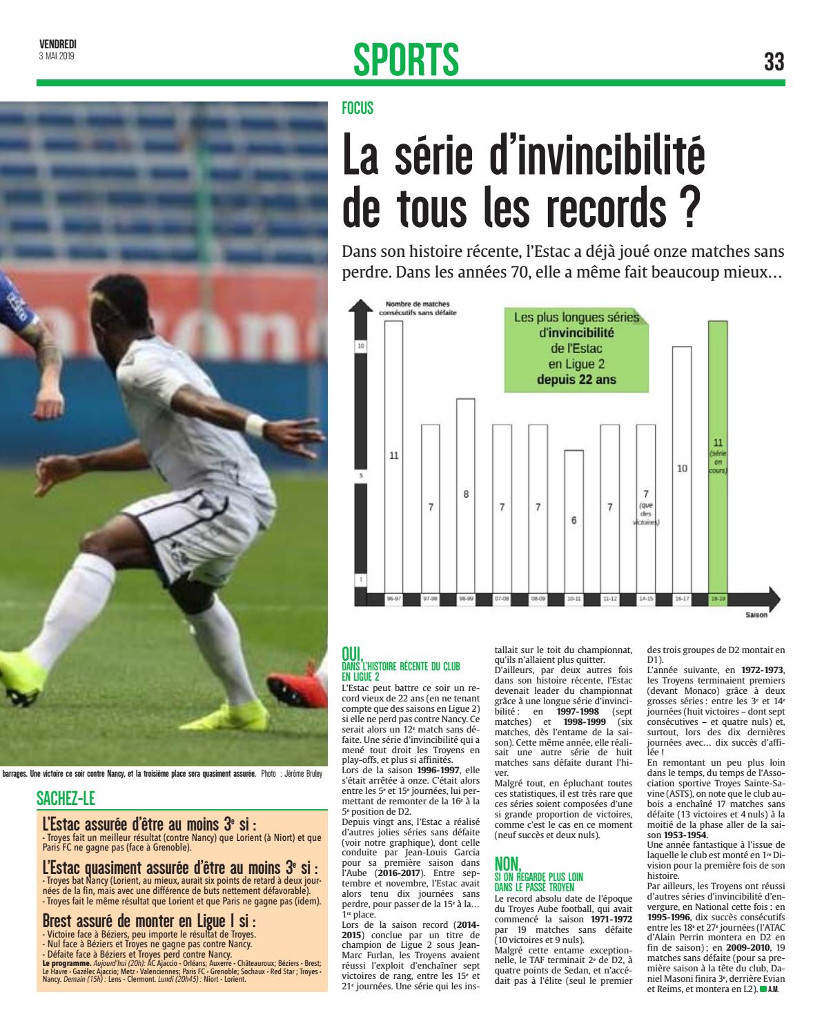 e L’Estac quasiment assurée d’être au moins 3 si : - Troyes bat Nancy (Lorient, au mieux, aurait six points de retard à deux journées de la fin, mais avec une différence de buts nettement défavorable). - Troyes fait le même résultat que Lorient et que Paris ne gagne pas (idem).