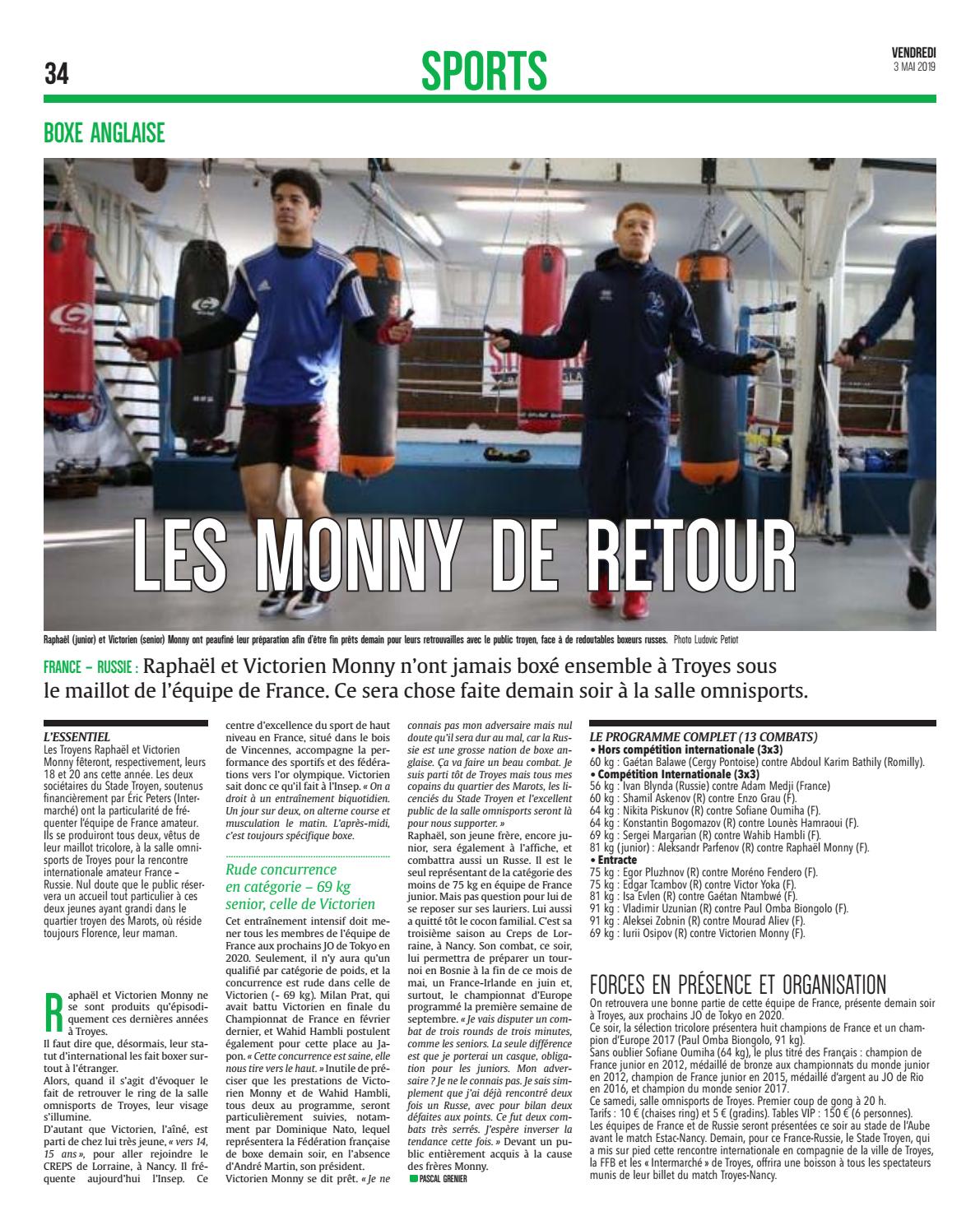 connais pas mon adversaire mais nul doute qu’il sera dur au mal, car la Russie est une grosse nation de boxe anglaise. Ça va faire un beau combat. Je suis parti tôt de Troyes mais tous mes copains du quartier des Marots, les licenciés du Stade Troyen et l’excellent public de la salle omnisports seront là pour nous supporter. » Raphaël, son jeune frère, encore junior, sera également à l’affiche, et combattra aussi un Russe. Il est le seul représentant de la catégorie des moins de 75 kg en équipe de France junior. Mais pas question pour lui de se reposer sur ses lauriers. Lui aussi a quitté tôt le cocon familial. C’est sa troisième saison au Creps de Lorraine, à Nancy. Son combat, ce soir, lui permettra de préparer un tournoi en Bosnie à la fin de ce mois de mai, un France-Irlande en juin et, surtout, le championnat d’Europe programmé la première semaine de septembre. « Je vais disputer un combat de trois rounds de trois minutes, comme les seniors. La seule différence est que je porterai un casque, obligation pour les juniors. Mon adversaire ? Je ne le connais pas. Je sais simplement que j’ai déjà rencontré deux fois un Russe, avec pour bilan deux défaites aux points. Ce fut deux combats très serrés. J’espère inverser la tendance cette fois. » Devant un public entièrement acquis à la cause des frères Monny.