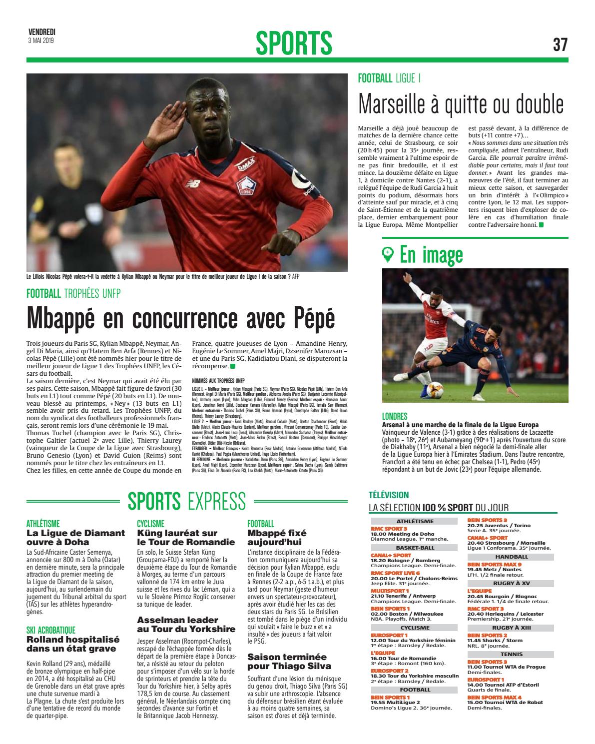 Mbappé en concurrence avec Pépé Trois joueurs du Paris SG, Kylian Mbappé, Neymar, Angel Di Maria, ainsi qu’Hatem Ben Arfa (Rennes) et Nicolas Pépé (Lille) ont été nommés hier pour le titre de meilleur joueur de Ligue 1 des Trophées UNFP, les Césars du football. La saison dernière, c’est Neymar qui avait été élu par ses pairs. Cette saison, Mbappé fait figure de favori (30 buts en L1) tout comme Pépé (20 buts en L1). De nouveau blessé au printemps, « Ney » (13 buts en L1) semble avoir pris du retard. Les Trophées UNFP, du nom du syndicat des footballeurs professionnels français, seront remis lors d’une cérémonie le 19 mai. Thomas Tuchel (champion avec le Paris SG), Christophe Galtier (actuel 2e avec Lille), Thierry Laurey (vainqueur de la Coupe de la Ligue avec Strasbourg), Bruno Genesio (Lyon) et David Guion (Reims) sont nommés pour le titre chez les entraîneurs en L1. Chez les filles, en cette année de Coupe du monde en