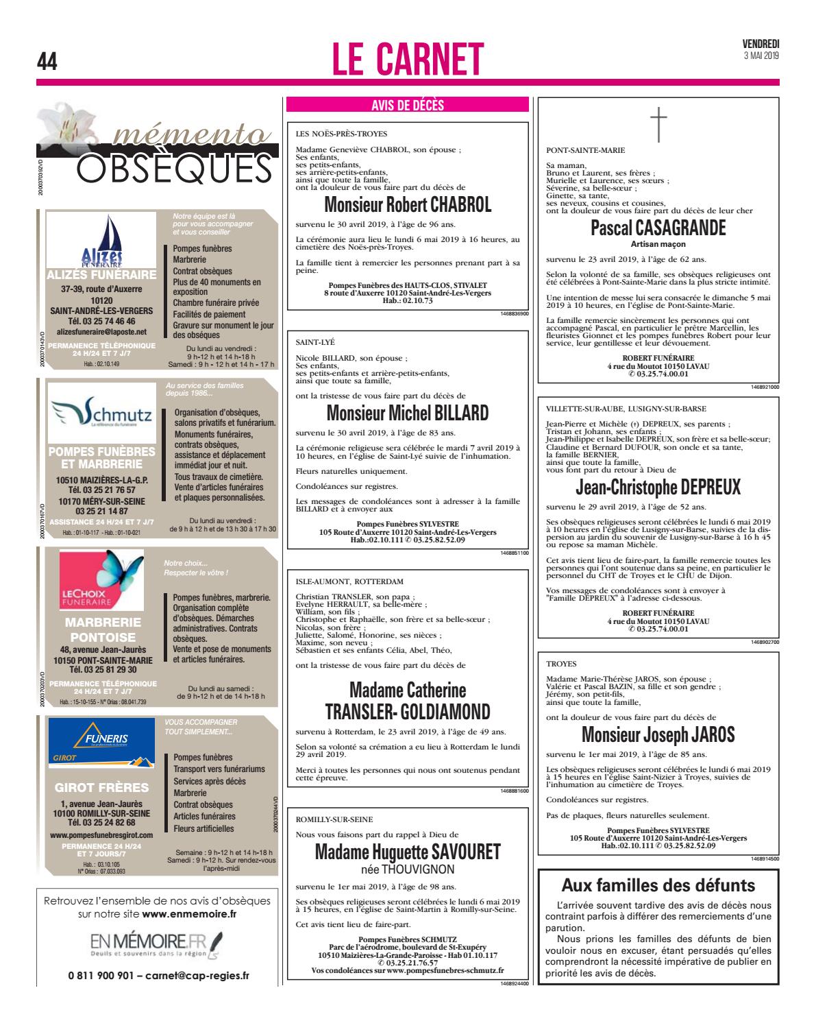 survenu le 29 avril 2019, à l’âge de 52 ans. Ses obsèques religieuses seront célébrées le lundi 6 mai 2019 à 10 heures en l’église de Lusigny-sur-Barse, suivies de la dispersion au jardin du souvenir de Lusigny-sur-Barse à 16 h 45 ou repose sa maman Michèle.