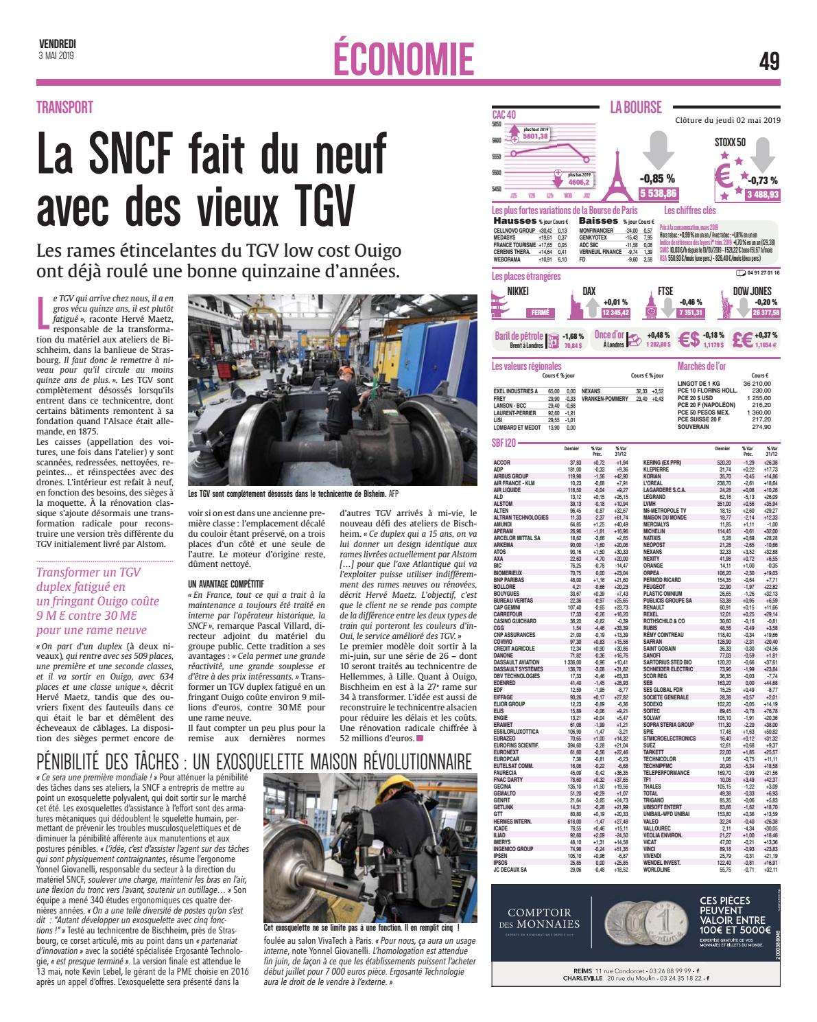 d’autres TGV arrivés à mi-vie, le nouveau défi des ateliers de Bischheim. « Ce duplex qui a 15 ans, on va lui donner un design identique aux rames livrées actuellement par Alstom […] pour que l’axe Atlantique qui va l’exploiter puisse utiliser indifféremment des rames neuves ou rénovées, décrit Hervé Maetz. L’objectif, c’est que le client ne se rende pas compte de la différence entre les deux types de train qui porteront les couleurs d’inOui, le service amélioré des TGV. » Le premier modèle doit sortir à la mi-juin, sur une série de 26 – dont 10 seront traités au technicentre de Hellemmes, à Lille. Quant à Ouigo, Bischheim en est à la 27e rame sur 34 à transformer. L’idée est aussi de reconstruire le technicentre alsacien pour réduire les délais et les coûts. Une rénovation radicale chiffrée à 52 millions d’euros.