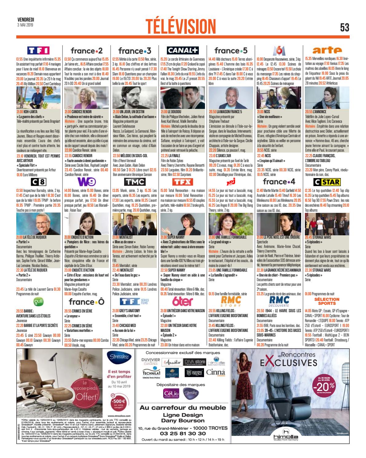 21.00 ENQUÊTE D’ACTION « Pompiers de Nice : nos héros du quotidien » Présenté par Marie-Ange Casalta Enquête d’Action vous emmène ce soir à Nice, cinquième ville de France et capitale de la Côte d’Azur. 23.00 ENQUÊTE D’ACTION « Côte d’Azur : missions de haut vol pour les gendarmes » Magazine présenté par 23.45 La télé de Laurent Gerra 01.30 Marie-Ange Casalta 00.00 Enquête d’action, mag. Programmes de nuit