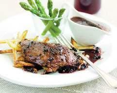 Servez les steaks nappés de sauce et accom pagnés d’asperges à la vapeur et de frites fines.