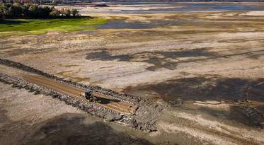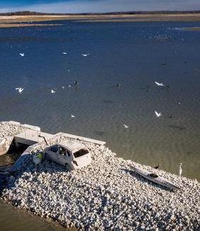 la nature qui profitent d’un paysage qui révèle un aspect unique du lac. Les 206 millions de mètres cubes d’eau évacués laissent place à une étendue de terre argileuse, de restes d’arbres prenant parfois la forme d’animaux légendaires, de poches d’eau salvatrices pour le poisson, d’épaves et de route engloutie. 2300 hectares mis à nu pour le plus grand plaisir des oiseaux migrateurs.