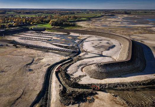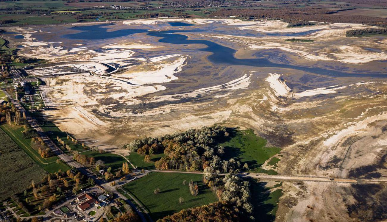 semble de l’opération de rénovation. Vus du ciel, le port de plaisance, les plages, la forêt, les digues et l’étendue du lac vide