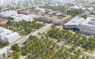 Le futur bĂątiment MadeleineÂBrĂšs du nouveau CHU, visible au centre, fera la jonction entre lâhĂŽpital historique MaisonÂBlanche (en brique à  gauche) et le nouveau bĂątiment ChristianÂCabrol (Ă Â droite). Image Pargade Architectes