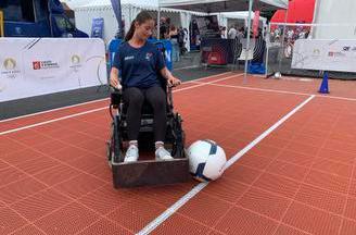 DANS LE VILLAGE OLYMPIQUE, on célèbre et on s’initie aux sports paralympiques. Ici, le public peut assister à des démonstrations de foot fauteuil et de cécifoot. Pour cette dernière discipline, tout un chacun peut enfiler un bandeau occultant la vue et se laisser guider par des animateurs tapant dans leurs mains, balle au pied bien sûr.
